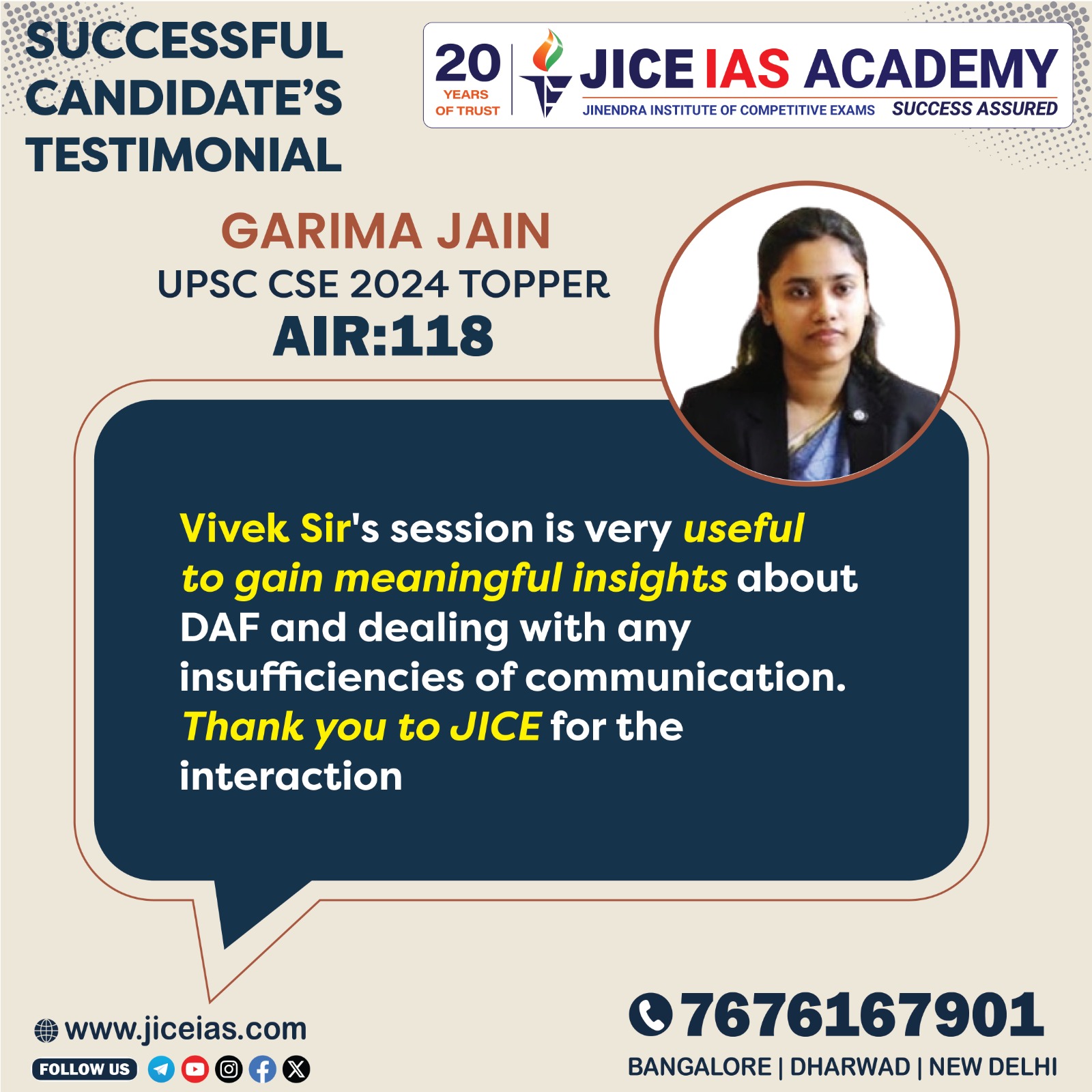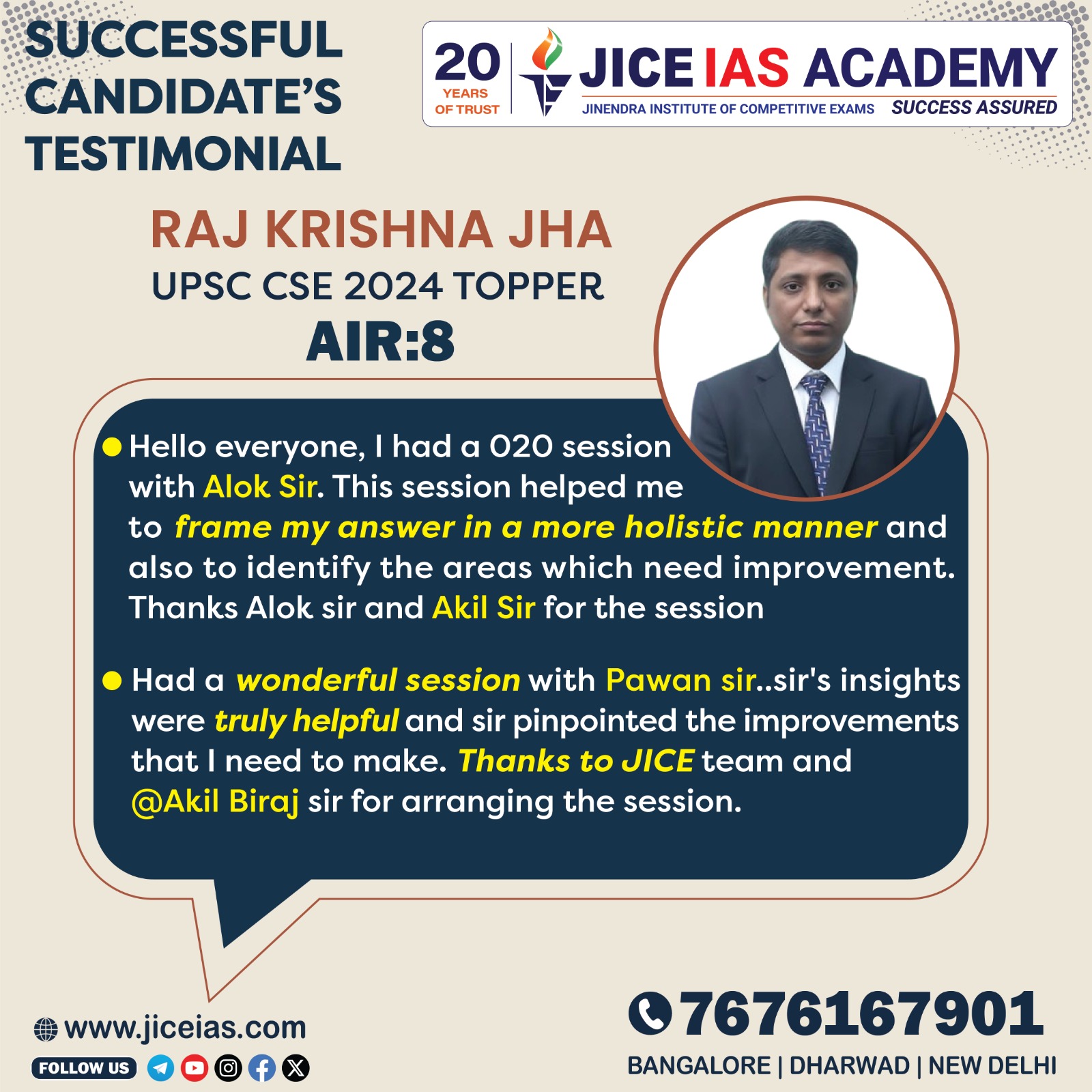 I would like to thank JICE and Akil sir for constant guidance in throughout my preparation. Their commitment to provide right guidance in this competitive exams in truly commendable. I wish all success to JICE academy and its students for their further endeavours in competitive exams.