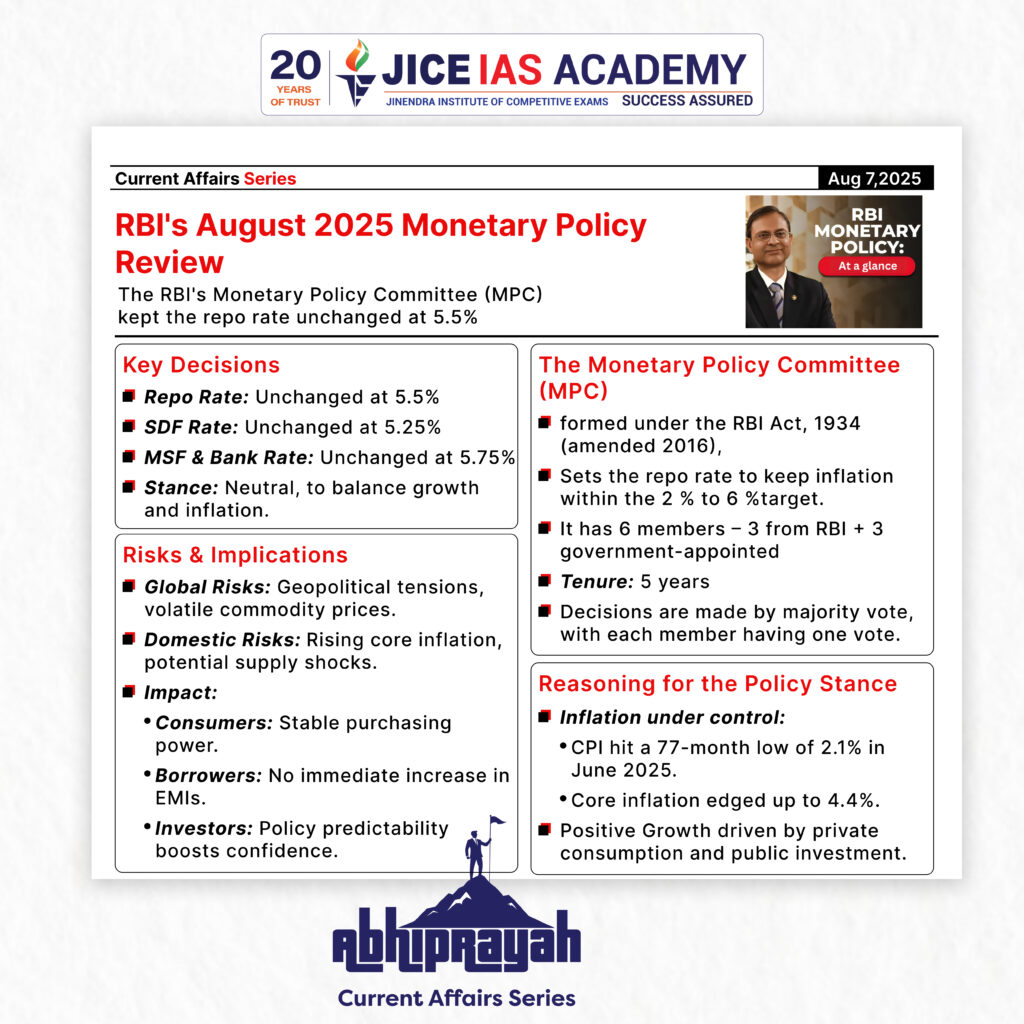 UPSC CURRENT AFFAIRS – 07th August 2025 Home / RBI’s August 2025 Monetary Policy Review Why in News? The RBI’s Monetary Policy Committee (MPC) kept the repo rate unchanged at 5.5% while projecting GDP growth at 6.5% and CPI inflation at 3.1% for 2025-26 amid global uncertainties. About Monetary Policy Committee (MPC) The Monetary Policy Committee (MPC) is a statutory body formed under the RBI Act, 1934 (amended in 2016) to decide the benchmark interest rate (repo rate) required to contain inflation within a target level. Composition: 6 members total 3 from RBI: RBI Governor (Chairperson) Deputy Governor (in charge of monetary policy) One RBI officer nominated by the Central Board 3 appointed by the Government of India Independent members with expertise in economics, banking, or finance Set by Government of India in consultation with RBI for 5-year terms (currently till March 2026) Each member has one vote and Decisions taken by majority Key Decisions of the MPC Recently, the Reserve Bank of India’s (RBI) Monetary Policy Committee (MPC) decided to maintain the repo rate at 5.5%, while continuing its neutral policy stance, indicating a careful balancing act between supporting economic growth and ensuring price stability. Repo Rate: Held steady at 5.5% Standing Deposit Facility (SDF): Unchanged at 5.25% Marginal Standing Facility (MSF) & Bank Rate: Maintained at 5.75% Stance: Neutral, allowing flexibility to respond to evolving macroeconomic conditions Reasoning Behind the MPC’s Decision The decision reflects a data-driven and cautious approach by the RBI, keeping in view the evolving domestic and global economic conditions: 1. Inflation Trends CPI Headline Inflation dropped to a 77-month low of 2.1% (y-o-y) in June 2025, mainly due to: A significant drop in food inflation Improved agricultural output Effective supply-side measures Core inflation, however, inched up slightly to 4.4% in June due to: Rising gold prices Revised CPI Forecast for 2025-26: 3.1% (earlier 3.7%), still within RBI’s target band of 4% ± 2% Q2: 2.1% Q3: 3.1% Q4: 4.4% Q1:2026-27: 4.9% 2. Growth Outlook Domestic growth remains resilient, supported by: Private consumption Public infrastructure investment However, external headwinds continue to pose risks: Geopolitical tensions Trade barriers Volatile global financial markets GDP Growth Projection for 2025-26: 6.5% retained Q1: 6.5% Q2: 6.7% Q3: 6.6% Q4: 6.3% Q1:2026-27 projected at 6.6% Growth risks remain evenly balanced RBI Governor’s Highlights RBI Governor Sanjay Malhotra emphasized the MPC’s dual role: Supporting growth in the face of global uncertainty Ensuring price stability, the primary mandate of monetary policy Monetary Policy Framework: A Balancing Act India’s Flexible Inflation Targeting (FIT) framework mandates the RBI to: Maintain CPI inflation at 4%, with a band of ±2% Support growth while ensuring monetary and financial stability The August 2025 decision reflects: Confidence in the domestic growth momentum Cautious optimism about continued inflation moderation Willingness to act proactively as global dynamics shift Risks and Challenges Global risks: Unresolved geopolitical conflicts Sluggish disinflation in advanced economies Volatile commodity prices Continued trade tensions Domestic concerns: Core inflation creeping up Risk of supply shocks (e.g., monsoon variability, food inflation) Implications for the Indian Economy Area Likely Impact Consumers Lower inflation = stable purchasing power Borrowers Stable repo rate = no rise in EMIs for now Investors Predictability in policy = increased confidence Government Encouragement for continued capital spending Financial Markets Stability in interest rates = reduced volatility Forward Guidance The RBI emphasized: Continued agility and data-dependence Transparent, credible communication Focus on medium-term price stability while nurturing growth. Introduction Economic Implications For Indian Exporters These reforms reduce transaction costs and compliance hurdles Encourage a more competitive and efficient export environment Promote value addition in key sectors like leather For Tamil Nadu The reforms particularly benefit the state’s leather industry, a major contributor to employment and exports Boost the marketability of GI-tagged E.I. leather, enhancing rural and traditional industries For Trade Policy These decisions indicate a shift from regulatory controls to policy facilitation Reinforce the goals of Make in India, Atmanirbhar Bharat, and India’s ambition to become a leading export power Recently, BVR Subrahmanyam, CEO of NITI Aayog, claimed that India has overtaken Japan to become the fourth-largest economy in the world, citing data from the International Monetary Fund (IMF). India’s rank as the world’s largest economy varies by measure—nominal GDP or purchasing power parity (PPP)—each with key implications for economic analysis. Significance and Applications