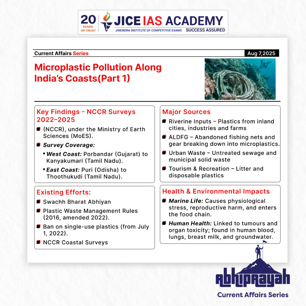 UPSC CURRENT AFFAIRS – 07th August 2025 Home / Microplastic Pollution Along India’s Coasts Why in News? The National Centre for Coastal Research (NCCR) found that riverine inputs and abandoned fishing gear are the major sources of microplastic pollution along India’s coasts. Introduction Microplastic pollution is emerging as a major environmental concern in India, especially along its vast coastline. On August 6, 2025, Union Minister Jitendra Singh informed the Lok Sabha that “riverine inputs” and abandoned, lost, and discarded fishing gear (ALDFG) are the major sources of microplastic pollution along India’s coasts. This statement aligns with the findings of scientific studies and recent surveys conducted by national research institutions. What Are Microplastics? Microplastics are tiny plastic particles ranging in size from 1 micrometre (µm) to 5 millimetres (mm). They are broadly classified into two types: Primary microplastics: Manufactured at a microscopic size for specific uses, such as microbeads found in cosmetics, personal care products, and industrial abrasives. Secondary microplastics: Result from the breakdown of larger plastic items due to exposure to sunlight, wind, wave action, and microbial activity. These particles are pervasive in marine and terrestrial ecosystems and are known to persist for centuries due to their non-biodegradable nature. Findings from Coastal Surveys (2022–2025) Conducted by: National Centre for Coastal Research (NCCR), under the Ministry of Earth Sciences (MoES). Coverage: West Coast: 19 transects surveyed from Porbandar (Gujarat) to Kanyakumari (Tamil Nadu). East Coast: 25 transects sampled from Puri (Odisha) to Thoothukudi (Tamil Nadu). Key Findings: Major Sources: Riverine inputs: Rivers carry microplastics from inland urban, agricultural, and industrial sources to the ocean. ALDFG: Fishing nets, lines, and gear abandoned or lost at sea break down into microplastics. Media surveyed: Both water and sediment samples were analyzed to assess the concentration and types of microplastic particles. Health and Environmental Impacts Marine and Aquatic Life: Microplastics can accumulate in the bodies of marine organisms, leading to physiological stress, reproductive issues, and even death. They can also enter the food chain, impacting larger species including humans. Human Health: Studies have increasingly linked microplastic exposure to tumours, hormonal disruption, and organ toxicity. They have been found in human blood, lungs, breast milk, and now, groundwater and food items. Microplastics in Food and Water 1. Delhi Groundwater Contamination A recent study reported microplastic contamination in Delhi’s groundwater, raising concerns about the spread of microplastics into drinking water sources. 2. FSSAI’s Investigation The Food Safety and Standards Authority of India (FSSAI) commissioned a project in 2024 to: Assess microplastic contamination in food products. Develop detection methods and propose safety standards. 3. Toxics Link Study Environmental group Toxics Link tested 10 salt and sugar samples. Microplastics were found in all samples. Forms identified: fibres, pellets, films, and fragments. Contributing Factors to Coastal Microplastic Pollution Source Description Riverine Inputs Plastics from inland cities, industries, and agricultural runoff enter rivers and eventually the sea. ALDFG Fishing nets and gear, often made of nylon and synthetic polymers, disintegrate and contribute to microplastic pollution. Urban Waste Untreated sewage and municipal solid waste often carry microplastics to water bodies. Tourism and Recreational Activities Plastics used in packaging, disposable products, and tourist litter contribute to local pollution. Policy and Research Interventions Existing Efforts: Swachh Bharat Abhiyan and Plastic Waste Management Rules (2016, amended 2022). Ban on single-use plastics (from July 1, 2022). NCCR Coastal Surveys: Key step in mapping microplastic hotspots. Needed Measures: Stricter enforcement of waste segregation and recycling. Improved fishing gear tracking and retrieval mechanisms. Public awareness campaigns about the dangers of plastic littering. Standards for microplastics in food and water by FSSAI and BIS (Bureau of Indian Standards). Conclusion Microplastic pollution in India is no longer a latent threat—it is visible, measurable, and increasingly harmful. The evidence from the coastal surveys, studies in Delhi’s groundwater, and microplastic traces in daily-use food products paints a grim picture. Effective mitigation will require coordinated action across ministries, scientific innovation, and citizen responsibility. As India progresses towards sustainable development, tackling microplastic pollution must be a national environmental priority. Introduction Economic Implications For Indian Exporters These reforms reduce transaction costs and compliance hurdles Encourage a more competitive and efficient export environment Promote value addition in key sectors like leather For Tamil Nadu The reforms particularly benefit the state’s leather industry, a major contributor to employment and exports Boost the marketability of GI-tagged E.I. leather, enhancing rural and traditional industries For Trade Policy These decisions indicate a shift from regulatory controls to policy facilitation Reinforce the goals of Make in India, Atmanirbhar Bharat, and India’s ambition to become a leading export power Recently, BVR Subrahmanyam, CEO of NITI Aayog, claimed that India has overtaken Japan to become the fourth-largest economy in the world, citing data from the International Monetary Fund (IMF). India’s rank as the world’s largest economy varies by measure—nominal GDP or purchasing power parity (PPP)—each with key implications for economic analysis. Significance and Applications