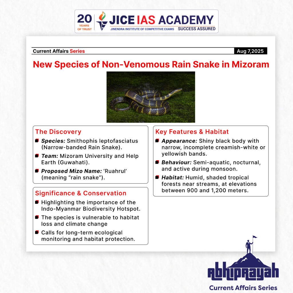 UPSC CURRENT AFFAIRS – 07th August 2025 Home / New Species of Non-Venomous Rain Snake Discovered in Mizoram Why in News? A new species of non-venomous rain-loving snake, Smithophis leptofasciatus (narrow-banded rain snake), has been discovered in Mizoram’s tropical forests. Introduction A team of Indian herpetologists from Mizoram University and Help Earth, a Guwahati-based biodiversity conservation group, has discovered a new species of rain-loving, non-venomous snake from the tropical forests of Mizoram. The discovery was published in the reputed journal Taprobanica: The Journal of Asian Biodiversity. This new species, named the Narrow-banded Rain Snake (Smithophis leptofasciatus), is a significant addition to the genus Smithophis and underlines the ecological importance of Northeast India as a biodiversity hotspot. Key Details of the Discovery 1. Taxonomic Classification Genus: Smithophis Species: leptofasciatus Common Name: Narrow-banded Rain Snake Proposed Mizo Name: ‘Ruahrul’, meaning “rain snake” Etymology: The species name “leptofasciatus” is derived from a hybrid of Greek and Latin words, meaning “narrow-banded,” which refers to its distinct dorsal pattern. 2. Morphological and Genetic Features Appearance: Shiny black body with narrow, incomplete creamish-white or yellowish-lime transverse bands. Size: Small, slender-bodied. Distinction: Initially confused with Smithophis bicolor, but molecular and morphological analyses confirmed it as a separate species. Reproductive Data: A gravid female in captivity laid six eggs, offering rare data on the reproduction of rain snakes. 3. Habitat and Behaviour Location Found: Humid, shaded microhabitats in elevated tropical forests of Mizoram, especially near small streams. Elevation: Between 900 and 1,200 meters above sea level. Behaviour: Semi-aquatic, nocturnal, and active during monsoon season, hence the name “rain snake.” Significance of the Discovery 1. Biodiversity Richness of Northeast India This is the third species of the genus Smithophis discovered in Mizoram: Smithophis atemporalis Smithophis mizoramensis Smithophis leptofasciatus (newly described) Reinforces Mizoram’s role as a center of speciation and endemism, making it a crucial region in the Indo-Myanmar Biodiversity Hotspot. 2. Scientific Contribution Enhances knowledge about the little-known genus Smithophis. Highlights the importance of integrating field observations with genetic research for accurate taxonomy. Provides new reproductive data, previously undocumented in this genus. 3. Conservation Concerns Habitat Specificity: The snake is forest-dependent and occupies a narrow elevational range, making it vulnerable to habitat loss and degradation. The study recommends long-term surveys, ecological monitoring, and habitat protection efforts to conserve the species. The species’ restricted distribution and reliance on monsoonal ecosystems may also render it sensitive to climate change impacts. Policy Implications Encourages scientific institutions and biodiversity groups to conduct microhabitat-level studies in lesser-known ecosystems. May prompt the State and Central governments to declare biodiversity-rich zones as conservation reserves. Conclusion The discovery of the narrow-banded rain snake (Smithophis leptofasciatus) from Mizoram is not just a taxonomic addition but a reminder of the rich but fragile ecosystems of Northeast India. As more such species come to light through field science and molecular taxonomy, it becomes essential to balance developmental activities with ecosystem conservation. Protecting such endemic species requires collaborative efforts among research institutions, local communities, and policy-makers to ensure the long-term sustainability of India’s ecological wealth. Introduction Economic Implications For Indian Exporters These reforms reduce transaction costs and compliance hurdles Encourage a more competitive and efficient export environment Promote value addition in key sectors like leather For Tamil Nadu The reforms particularly benefit the state’s leather industry, a major contributor to employment and exports Boost the marketability of GI-tagged E.I. leather, enhancing rural and traditional industries For Trade Policy These decisions indicate a shift from regulatory controls to policy facilitation Reinforce the goals of Make in India, Atmanirbhar Bharat, and India’s ambition to become a leading export power Recently, BVR Subrahmanyam, CEO of NITI Aayog, claimed that India has overtaken Japan to become the fourth-largest economy in the world, citing data from the International Monetary Fund (IMF). India’s rank as the world’s largest economy varies by measure—nominal GDP or purchasing power parity (PPP)—each with key implications for economic analysis. Significance and Applications