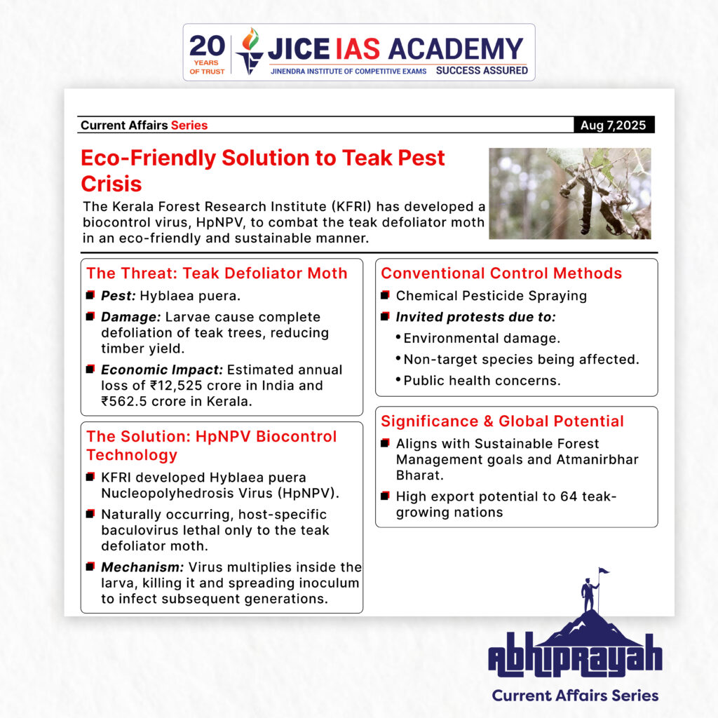 UPSC CURRENT AFFAIRS – 07th August 2025 Home / Eco-Friendly Solution to Teak Pest Crisis: KFRI’s HpNPV Technology Why in News? The Kerala Forest Research Institute (KFRI) has developed a biocontrol virus, HpNPV, to combat the teak defoliator moth in an eco-friendly and sustainable manner. Introduction Teak (Tectona grandis) is one of the most valuable tropical hardwoods in the world. However, teak plantations in India and other countries face a persistent threat from the teak defoliator moth (Hyblaea puera), a pest known for its cyclical mass outbreaks that devastate teak foliage. Conventional chemical pest control methods have proven both environmentally harmful and socially contentious. In a groundbreaking development, the Kerala Forest Research Institute (KFRI) has identified, mass-produced, and patented a host-specific virus, the Hyblaea puera Nucleopolyhedrosis Virus (HpNPV), which can effectively and sustainably control this pest without harming the broader ecosystem. Teak Defoliator Moth (Hyblaea puera) Nature of Damage The larvae of H. puera feed voraciously on teak leaves. Infestation can happen up to six times annually, resulting in: Complete defoliation of trees. Trees diverting energy towards leaf regeneration instead of growth. Resultant reduction in timber yield and weakened plant health. Economic Impact Estimated loss of 3 cubic metres of wood per hectare per year. This translates to: ₹562.5 crore annual loss in Kerala. ₹12,525 crore in India. Conventional Control Methods and Their Limitations Chemical Pesticide Spraying Tried in Konni (Kerala) and Barnavappara (Madhya Pradesh). Invited protests due to: Environmental damage. Non-target species being affected. Public health concerns. KFRI even raised ethical concerns at the 1980 Forestry Conference with a paper titled “The problem of teak defoliator: to spray or not to spray?” HpNPV Biocontrol Technology Hyblaea puera Nucleopolyhedrosis Virus (HpNPV) is: A naturally occurring baculovirus. Highly host-specific – targets only teak defoliator larvae. Lethal to the larvae; causes internal virus multiplication. Eco-friendly and non-toxic to other forest organisms. How it Works The virus multiplies a trillion times inside a single larva. Once the larva dies, its body releases a large quantity of inoculum into the environment. Even sub-lethal infections become lethal in the next generation, due to vertical transmission. Application is most effective in the early larval stage during seasonal outbreaks. Field Validation and Technology Transfer Field Trials Conducted in Nilambur (Malappuram, Kerala) — India’s cradle of teak. Proved successful in preventing large-scale defoliation. Implementation Readiness KFRI has transferred outbreak monitoring and virus application protocols to the Forest Department. Formal adoption awaited at the departmental level. National and Global Significance India-Specific Importance India is a major teak-growing country with a large public-sector forestry base. The technology aligns with: Sustainable forest management goals. National Biodiversity Action Plan. Atmanirbhar Bharat in Biotech and Environment Sectors. Export Potential Out of 64 teak-growing countries, many have banned chemical pesticides. This positions HpNPV as a desirable export product, especially for: Myanmar Laos Thailand African and Latin American nations with new teak plantations. Global Showcasing KFRI will present HpNPV at the KSCSTE R&D Summit 2025, to be held on August 7, Thiruvananthapuram, projecting it as: A scalable model for forest pest management. A biotechnological solution with global relevance. Way Forward Policy Adoption: Forest departments across teak-growing states (Kerala, Madhya Pradesh, Odisha, Andhra Pradesh) should formally adopt the HpNPV protocol. Scale-Up Production: Infrastructure for mass multiplication of the virus should be set up in collaboration with bio-control labs and startups. Global Partnerships: India can leverage this innovation under South-South cooperation, positioning itself as a leader in green biotechnology. Public Awareness: Educating forestry personnel and communities will enhance the adoption of this safe alternative. Regulatory Support: National and state regulatory bodies should expedite approvals for field-level deployment. Introduction Economic Implications For Indian Exporters These reforms reduce transaction costs and compliance hurdles Encourage a more competitive and efficient export environment Promote value addition in key sectors like leather For Tamil Nadu The reforms particularly benefit the state’s leather industry, a major contributor to employment and exports Boost the marketability of GI-tagged E.I. leather, enhancing rural and traditional industries For Trade Policy These decisions indicate a shift from regulatory controls to policy facilitation Reinforce the goals of Make in India, Atmanirbhar Bharat, and India’s ambition to become a leading export power Recently, BVR Subrahmanyam, CEO of NITI Aayog, claimed that India has overtaken Japan to become the fourth-largest economy in the world, citing data from the International Monetary Fund (IMF). India’s rank as the world’s largest economy varies by measure—nominal GDP or purchasing power parity (PPP)—each with key implications for economic analysis. Significance and Applications