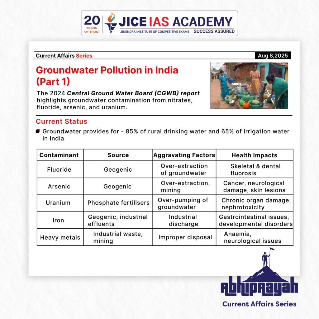 UPSC CURRENT AFFAIRS – 08th August 2025 Home / Groundwater Pollution in India – A Silent Public Health Emergency Why in News? The 2024 Central Ground Water Board (CGWB) report revealed that widespread contamination by nitrates, fluoride, arsenic, uranium, and industrial toxins leading to serious Groundwater contamination in India. Introduction Despite India’s abundant river systems and seasonal monsoons, groundwater remains the primary source of drinking water and irrigation. 85% of rural drinking water 65% of irrigation water However, unregulated extraction, industrial discharge, and agricultural chemical overuse have triggered an invisible crisis—groundwater pollution. Once considered nature’s purest reserve, it is now contaminated with nitrates, heavy metals, arsenic, fluoride, uranium, and pathogenic microbes, posing a grave public health and ecological challenge. Current Status – What the Data Shows Source: 2024 Annual Groundwater Quality Report – Central Ground Water Board (CGWB) Coverage: Samples from 440 districts Nitrates – Caused by overuse of chemical fertilisers and leaching from septic tanks; can lead to Blue Baby Syndrome (methemoglobinemia) in infants. Fluoride – Geogenic in origin, worsened by over-extraction; causes skeletal and dental fluorosis. Arsenic – Geogenic, but aggravated by over-extraction and mining; linked to cancer, neurological damage, and skin lesions. Uranium – Resulting from phosphate fertiliser use and over-pumping; causes chronic organ damage and nephrotoxicity. Iron – From industrial effluents and geogenic sources; leads to gastrointestinal and developmental disorders. Heavy metals – From industrial waste and mining; cause anaemia and neurological issues. Case Studies – ‘Groundwater Death Zones’ Budhpur, Baghpat (U.P.) – 13 deaths in 15 days from kidney failure; linked to paper and sugar mill discharges. Jalaun (U.P.) – Petroleum-like fluids in handpumps from suspected underground fuel leaks. Paikarapur, Bhubaneswar – Faulty sewage plant led to illness in 500+ residents. These incidents reflect weak enforcement, lack of monitoring, and institutional apathy. Health Impacts – Evidence from Studies Fluoride – 230 districts affected; 66 million people with skeletal fluorosis. Rajasthan alone has >11,000 affected villages. Arsenic – In Ballia (U.P.), 200 µg/L recorded—20× WHO limit—linked to >10,000 cancer cases. Nitrate – 56% of districts exceed safe levels; 28% rise in hospital admissions for nitrate toxicity (2018–2023). Uranium – Malwa region study: 66% samples pose health risks for children. Heavy Metals – ICMR-NIREH: high blood lead levels in children near industrial clusters. Why the Crisis Persists – Structural Gaps Institutional Fragmentation – CGWB, CPCB, SPCBs, Ministry of Jal Shakti work in silos. Weak Legal Framework – Water Act, 1974 scarcely covers groundwater; CGWB lacks statutory enforcement powers. Poor Monitoring – No real-time, publicly available data; contamination detected only after health crises. Over-Extraction – Lowers water table, concentrates pollutants, worsens salinity intrusion. Industrial & Urban Waste Mismanagement – Weak Zero Liquid Discharge enforcement, leaky septic systems, inadequate sewage treatment. Way Forward – Multi-Dimensional Strategy 1. Strengthen Legal & Institutional Framework Enact National Groundwater Pollution Control Framework. Empower CGWB with regulatory authority. Integrate efforts of CGWB, CPCB, SPCBs. 2. Modernize Monitoring Install real-time sensors, use remote sensing, maintain open-access platforms. Integrate with Health Management Information System (HMIS) for early outbreak detection. 3. Targeted Health & Remediation Measures Deploy arsenic & fluoride removal units at community level. Ensure piped safe water in high-risk zones. Promote nutritional interventions to reduce toxin absorption. 4. Regulate Agriculture & Industry Encourage organic and balanced nutrient management. Mandate strict compliance with Zero Liquid Discharge norms. Penalise illegal effluent discharges. 5. Community-Centric Water Governance Involve panchayats, water user associations, school programs in testing & awareness. Publicly display water quality data at village/town level. Conclusion India’s groundwater crisis is no longer about availability—it is about safety. With 600+ million people relying on it daily, contamination has become a public health emergency. The damage from pollutants like arsenic, fluoride, and heavy metals is irreversible, making prevention the only viable long-term solution. Introduction Economic Implications For Indian Exporters These reforms reduce transaction costs and compliance hurdles Encourage a more competitive and efficient export environment Promote value addition in key sectors like leather For Tamil Nadu The reforms particularly benefit the state’s leather industry, a major contributor to employment and exports Boost the marketability of GI-tagged E.I. leather, enhancing rural and traditional industries For Trade Policy These decisions indicate a shift from regulatory controls to policy facilitation Reinforce the goals of Make in India, Atmanirbhar Bharat, and India’s ambition to become a leading export power Recently, BVR Subrahmanyam, CEO of NITI Aayog, claimed that India has overtaken Japan to become the fourth-largest economy in the world, citing data from the International Monetary Fund (IMF). India’s rank as the world’s largest economy varies by measure—nominal GDP or purchasing power parity (PPP)—each with key implications for economic analysis. Significance and Applications