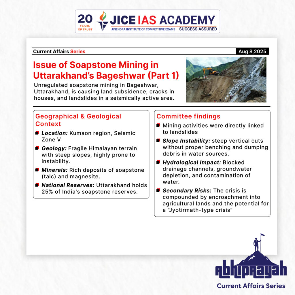 UPSC CURRENT AFFAIRS – 08th August 2025 Home / Issue of soapstone mining in Uttarakhand’s Bageshwar Why in News? Unregulated soapstone mining in Uttarakhand’s Bageshwar has triggered land subsidence, cracks, and landslides in a seismically vulnerable Himalayan zone. Introduction Bageshwar district in Uttarakhand has emerged as a significant site for soapstone and magnesite mining, but unregulated excavation has triggered ground deformation, land subsidence, rockslides, and cracks in habitations. A state government-appointed expert committee has submitted a report to the National Green Tribunal (NGT), linking mining activities to heightened landslide risks in a seismically vulnerable region. Geographical & Geological Context Location – Bageshwar lies in the Kumaon region of Uttarakhand, within Seismic Zone V, indicating the highest earthquake risk. Geological Setting – The region has steep slopes and fragile Himalayan lithology, making it highly susceptible to slope instability. Mineral Profile – Soapstone (talc): A metamorphic rock mainly composed of talc, used for construction, sculptures, countertops, sinks, and industrial talc for cosmetics, pharmaceuticals, ceramics. Magnesite: Used in refractory material and magnesium production. Distribution of Mines: Bageshwar – 169 mines (soapstone & magnesite) Pithoragarh – 28 mines Chamoli – 8 mines (soapstone) Uttarkashi – 1 mine (silica sand) National Reserves – Rajasthan (57%) and Uttarakhand (25%) hold the largest reserves of soapstone in India (Indian Bureau of Mines). Background to the Issue January 10, 2024 – The Uttarakhand High Court banned mining in Bageshwar after reports of: Cracks in houses Drying water sources Land subsidence in nearby villages Committee Formation – Included experts from: Geological Survey of India (GSI) Uttarakhand Landslide Mitigation and Management Centre Indian Institute of Remote Sensing (IIRS) Mandate – Conduct geological surveys of mines in Bageshwar, Kanda, and Dugnakuri tehsils. Assess whether mining is within designated lease boundaries. Recommend measures for a revised mining policy. Key Findings of the Committee Links to Geohazards Landslides – Mining removal of slope material and overburden dumping has triggered retrogressive debris slides. Ground Cracks – Linear cracks up to 50 meters long detected; risk of widening during monsoon or seismic activity. Subsidence – Observed even 100 meters upslope from pits, indicating underground material movement. Specific Incidents Google Earth imagery showed: No mine in August 2014. Post-mining, landslide in March 2019. Retrogression by February 2021 with downslope mine merging into landslide zone. Slope Instability Steep excavation without slope support. Violation of bench height norms (bench height = vertical distance between two mine benches). Dumping in water sources → Blockages, water contamination. Hydrological Impact Dumped overburden blocking surface drainage. Groundwater depletion due to altered aquifers. Risk of flash floods during cloudbursts due to blocked drainage. Secondary Risks Encroachment into agricultural and residential areas. Potential pipeline breaches → water infiltration into subsidence zones → higher landslide risk. Environmental & Socio-economic Implications Ecosystem damage – Siltation of streams, loss of biodiversity. Livelihood impact – Threat to agriculture and tourism. Disaster vulnerability – Increased risk of landslides and floods in already fragile Himalayan terrain. Public safety – Cracks in houses, displacement of communities. Policy and Regulatory Gaps Weak enforcement of mining lease boundaries. Inadequate monitoring of bench heights and slope stability. Absence of a centralized geo-referenced mining database. Poor post-mining reclamation and slope rehabilitation. Recommendations of the Committee Sustainable Mining Practices Limit excavation depth and steepness. Strict adherence to bench height regulations. Geo-referenced Database- Maintain precise mapping of mine lease boundaries for monitoring. Slope Stability Analysis- Scientific determination of safe bench heights and slope angles. On-site and Remote Monitoring- Combine physical inspections with satellite imagery and drone surveys. Drainage and Water Management- Prevent dumping in drainage systems; create silt traps. Policy Revision- Formulate stricter district-level mining policy integrating environmental safeguards. Post-mining Rehabilitation- Stabilize slopes, restore vegetation, and prevent debris flow. Way Forward Given the Himalayan region’s fragile geology, unregulated mining in Bageshwar poses compounded risks due to: Seismic susceptibility (Zone V) High rainfall-induced landslides Human settlement proximity An integrated approach combining scientific mining, strong regulatory enforcement, community involvement, and disaster risk reduction is crucial. A revised Uttarakhand Mining Policy should align with National Mineral Policy 2019 principles of sustainable development and environmental protection. Introduction Economic Implications For Indian Exporters These reforms reduce transaction costs and compliance hurdles Encourage a more competitive and efficient export environment Promote value addition in key sectors like leather For Tamil Nadu The reforms particularly benefit the state’s leather industry, a major contributor to employment and exports Boost the marketability of GI-tagged E.I. leather, enhancing rural and traditional industries For Trade Policy These decisions indicate a shift from regulatory controls to policy facilitation Reinforce the goals of Make in India, Atmanirbhar Bharat, and India’s ambition to become a leading export power Recently, BVR Subrahmanyam, CEO of NITI Aayog, claimed that India has overtaken Japan to become the fourth-largest economy in the world, citing data from the International Monetary Fund (IMF). India’s rank as the world’s largest economy varies by measure—nominal GD