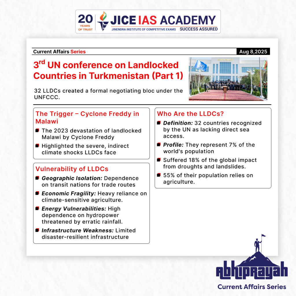 UPSC CURRENT AFFAIRS – 08th August 2025 Home / 3rd UN conference on landlocked countries Why in News? At the Third UN Conference on Landlocked Developing Countries (LLDCs) in Turkmenistan, 32 LLDCs formed a formal negotiating bloc under the UNFCCC. Introduction In August 2025, leaders from 32 Landlocked Developing Countries (LLDCs) gathered at the Third UN Conference on LLDCs in Awaza, Turkmenistan, to address their unique vulnerabilities to climate change. The highlight was the historic announcement of the LLDC Group as a formal negotiating bloc under the United Nations Framework Convention on Climate Change (UNFCCC). This development marks a significant shift in climate diplomacy, aimed at securing tailored support for nations disproportionately impacted by climate-related disasters despite contributing minimally to global emissions. The Trigger – Cyclone Freddy and the Malawi Case In 2023, Cyclone Freddy devastated Malawi—a landlocked nation—causing widespread flooding, landslides, and displacement. Despite no sea access, Malawi suffered indirect climate shocks through: Humanitarian crisis (loss of life, homes, and livelihoods) Food insecurity (damaged agriculture) Trade disruption (reliance on fragile corridors via coastal neighbours) The tragedy symbolised the invisible yet severe impacts of climate change on LLDCs. Who Are the LLDCs? Definition: Countries without direct territorial access to the sea, recognised under the UN-OHRLLS framework. Global Profile: Represent 7% of the world’s population Occupy 12% of global land area Account for 18% of people affected by droughts and landslides (2012–2023) 55% population reliant on agriculture (double the global average) Vulnerability of LLDCs 1. Geographic Isolation Dependence on coastal transit nations for imports/exports Long, costly, and fragile trade routes vulnerable to disruptions 2. Economic Fragility Low diversification; heavy dependence on climate-sensitive agriculture Net importers of cereals → vulnerable to global supply shocks 3. Energy Vulnerabilities Hydropower dependence + erratic rainfall patterns = energy insecurity 4. Infrastructure Weakness Limited disaster-resilient infrastructure Poor logistics hamper emergency response The Awaza Programme of Action – Key Outcomes 1. Formalisation of LLDC Group in UNFCCC Recognition as a distinct negotiating bloc in global climate forums Mandate to advocate for LLDC-specific adaptation and mitigation priorities 2. Demands and Proposals Minimum allocations of adaptation financing for LLDCs Streamlined access to climate technology transfer Investment in climate-resilient infrastructure Emergency logistics corridors for rapid disaster response 3. Strategic Approach Data-backed advocacy: satellite imagery, climate modelling, and human impact stories Emphasis on equity in climate negotiations—moving from symbolic vulnerability recognition to operational fairness Significance of the Move For LLDCs Ensures visibility in a negotiation space dominated by coastal and large economies Provides a united platform to press for tailored climate financing Addresses logistical and trade-related barriers to disaster relief For Global Climate Governance Brings nuance to vulnerability discussions (geography-specific challenges) Strengthens climate justice principles under the UNFCCC Could inspire other issue-specific coalitions (e.g., mountain nations, small dryland states) Challenges Ahead Bloc Overlap and Fragmentation Many LLDCs also belong to G77+China, LDC Group, and African Group of Negotiators Risk of diluted bargaining power if agendas diverge Resource Constraints Limited diplomatic capacity to sustain presence in multiple negotiations Dependence on External Support Financial and technical assistance from developed countries remains uncertain Implementation Gap Translating commitments in Awaza into concrete action will require binding mechanisms International Context – Climate Equity Debate LLDCs contribute minimally to global greenhouse gas emissions yet face disproportionate climate impacts (Polluter Pays Principle relevance) The Paris Agreement (2015) recognises “common but differentiated responsibilities” but does not have LLDC-specific provisions The LLDC bloc aims to insert their concerns into discussions on: Global Adaptation Goal Loss and Damage Fund Green Climate Fund allocations Way Forward Institutional Strengthening – LLDC secretariat for climate negotiations Alliances – Strategic partnerships with SIDS (Small Island Developing States) and LDCs for stronger collective bargaining Domestic Preparedness – Invest in disaster-resilient infrastructure and diversify economies Innovative Financing – Use blended finance, climate bonds, and public-private partnerships Knowledge Sharing – Exchange best practices among LLDCs in areas like climate-smart agriculture and renewable energy Conclusion The creation of the LLDC negotiating bloc is both a symbolic and strategic victory in the climate justice movement. For countries like Malawi, Bhutan, and others, this is not merely a diplomatic gesture—it is a lifeline. Whether the world listens will depend on how effectively the LLDC Group can transform geographic isolation into collective strength in the run-up to COP30 and beyond. Introduction Economic Implications For Indian Exporters These reforms reduce transaction costs and compliance hurdles Encourage a more competitive and efficient export environment Promote value addition in key sectors like leather For Tamil Nadu The reforms particularly benefit the state’s leather industry, a major contributor to employment and exports Boost the marketability of GI-tagged E.I. leather, enhancing rural and traditional industries For Trade Policy These decisions indicate a shift from regulatory controls to policy facilitation Reinforce the goals of Make in India, Atmanirbhar Bharat, and India’s ambition to become a leading export power Recently, BVR Subrahmanyam, CEO of N