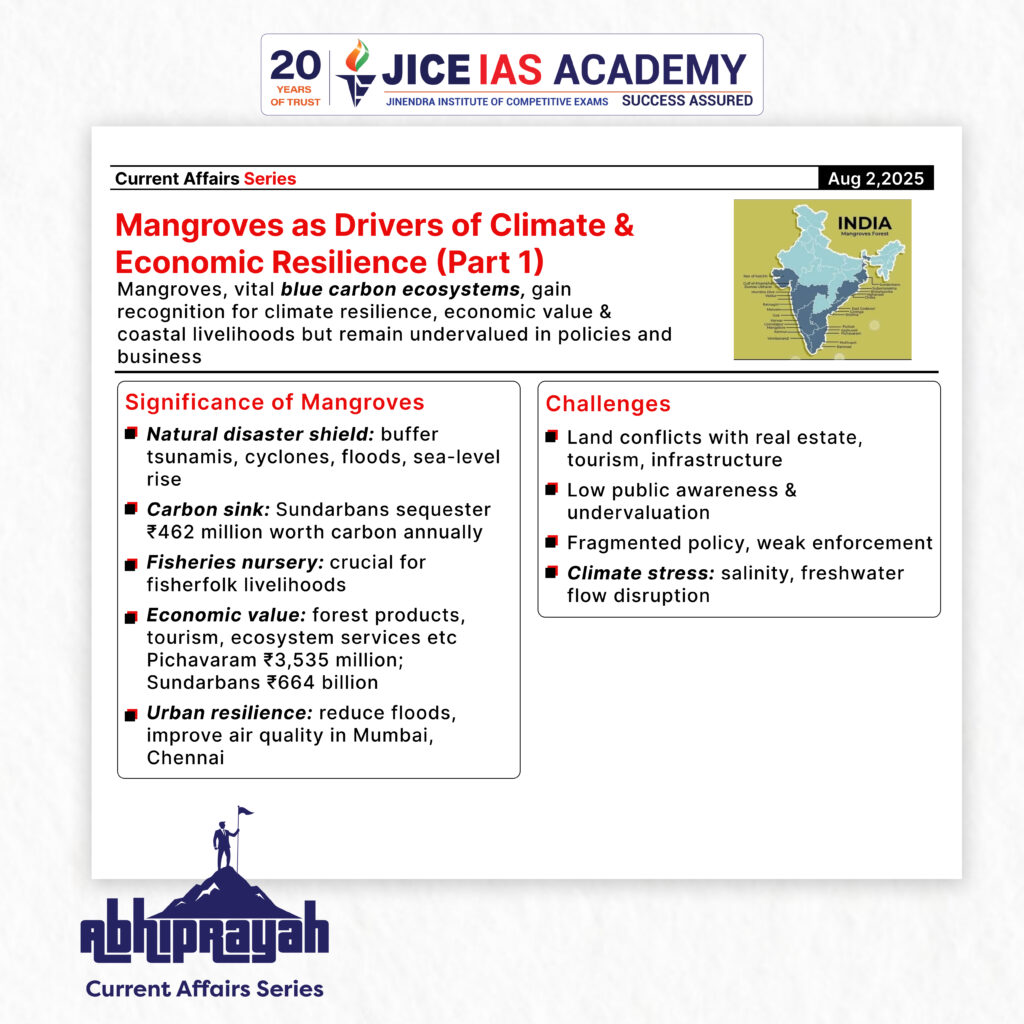 UPSC CURRENT AFFAIRS – 02nd August 2025 Home / Mangroves as Drivers of Climate and Economic Resilience Why in News? Mangroves, critical blue carbon ecosystems, are increasingly recognized for their vital role in climate resilience, economic stability, and sustainable livelihoods, yet remain undervalued in policy and business frameworks. Introduction Mangroves, once relegated to the periphery of environmental planning, are emerging as vital components of natural infrastructure. These intertidal forests along coastlines protect against extreme weather events, nurture biodiversity, sequester carbon, and sustain coastal livelihoods. Despite their substantial ecological and economic benefits, mangroves are often missing from financial balance sheets, infrastructure planning, and corporate responsibility frameworks. As India and the world face rising sea levels, urban coastal vulnerability, and biodiversity loss, mangroves offer a natural solution that combines climate adaptation with economic opportunity. Their conservation and regeneration now require a holistic, technology-enabled, community-led and science-based approach. Significance of Mangroves: Ecosystem and Economic Services Natural Disaster Shield: Act as buffers against tsunamis, cyclones, floods, and sea-level rise. Carbon Sequestration: Serve as ‘blue carbon’ sinks — Sundarbans alone sequester carbon worth ₹462 million annually. Fisheries and Livelihoods: Function as nurseries for juvenile fish; essential to fisherfolk and coastal livelihoods. Economic Value: Pichavaram mangroves (Tamil Nadu): ecosystem services valued at ₹3,535 million. Sundarbans (West Bengal): total ecosystem services worth ₹664 billion. Urban Resilience: In cities like Mumbai and Chennai, mangroves reduce flood risk, improve air quality, and provide green cover. Challenges to Mangrove Protection Land Use Conflicts: Real estate, infrastructure, and tourism developments threaten mangrove lands. Lack of Awareness: Ecosystem services are undervalued due to insufficient public understanding. Policy Gaps: Fragmented legal frameworks, weak enforcement, and lack of integration in development plans. Climate Pressure: Rising salinity and irregular freshwater flows disrupt ecosystem dynamics. Steps to Protect Mangroves Mapping with Technology: Leveraging Natural Capital Data Tools: Satellite imagery, drone data, and AI-driven geospatial analysis help quantify blue carbon and track degradation. Policy Impact: Improved mapping feeds into evidence-based policymaking and restoration prioritisation. Inclusion: Recognizes the ecological wisdom of coastal communities and supports equitable benefit-sharing. Community-Led Conservation: Empowering Coastal Stakeholders Livelihood Integration: Fisherfolk depend on mangroves for sustainable catch. Alternative livelihoods: aquaculture, beekeeping, eco-tourism. Degradation in Urban Settings: Mangroves near cities suffer due to pollution and encroachment. Solution Models: Community-based governance like Eco-Development Committees (EDCs) and Joint Forest Management Committees (JFMCs). Building trust and participation ensures long-term ecological health and social equity. Citizen Science and Engagement Platforms Participatory Monitoring: Citizens trained to assess: Mangrove area and health Freshwater flows and biodiversity indicators Community dependence and perceived ecosystem value Tools and Platforms: Development of a “Mangrove Health Tool” Public engagement through platforms like “Mangrove Mitras” (Friends of Mangroves) Outcome: Creates a feedback loop between citizen awareness, scientific insight, and local action. Policy and Business Imperatives Mainstream Mangroves in Planning: Recognize mangroves as economic infrastructure, not just biodiversity areas. Integrate mangroves in coastal zone regulations (CRZ), urban planning, and disaster risk reduction frameworks. Green Finance and Corporate Involvement: Encourage natural capital accounting. Facilitate carbon credits and ESG investments focused on mangrove regeneration. Coalition Approach: Government, private sector, civil society, and scientific institutions must collaborate. Mangrove Coalition efforts are an example of cross-sectoral governance. Way Forward Integrated Coastal Zone Management (ICZM) should prioritize mangrove preservation as a central theme. Link local conservation to national and global climate commitments such as India’s Panchamrit and SDGs. Data-driven conservation and people-centric policies are needed to secure long-term mangrove health. Reframe the narrative — “Mangroves drive business” — by showing their ROI in disaster savings, fishery yield, and carbon storage. Introduction Economic Implications For Indian Exporters These reforms reduce transaction costs and compliance hurdles Encourage a more competitive and efficient export environment Promote value addition in key sectors like leather For Tamil Nadu The reforms particularly benefit the state’s leather industry, a major contributor to employment and exports Boost the marketability of GI-tagged E.I. leather, enhancing rural and traditional industries For Trade Policy These decisions indicate a shift from regulatory controls to policy facilitation Reinforce the goals of Make in India, Atmanirbhar Bharat, and India’s ambition to become a leading export power Recently, BVR Subrahmanyam, CEO of NITI Aayog, claimed that India has overtaken Japan to become the fourth-largest economy in the world, citing data from the International Monetary Fund (IMF). India’s rank as the world’s largest economy varies by measure—nominal GDP or purchasing power parity (PPP)—each with key implications for economic analysis. Significance and Applications