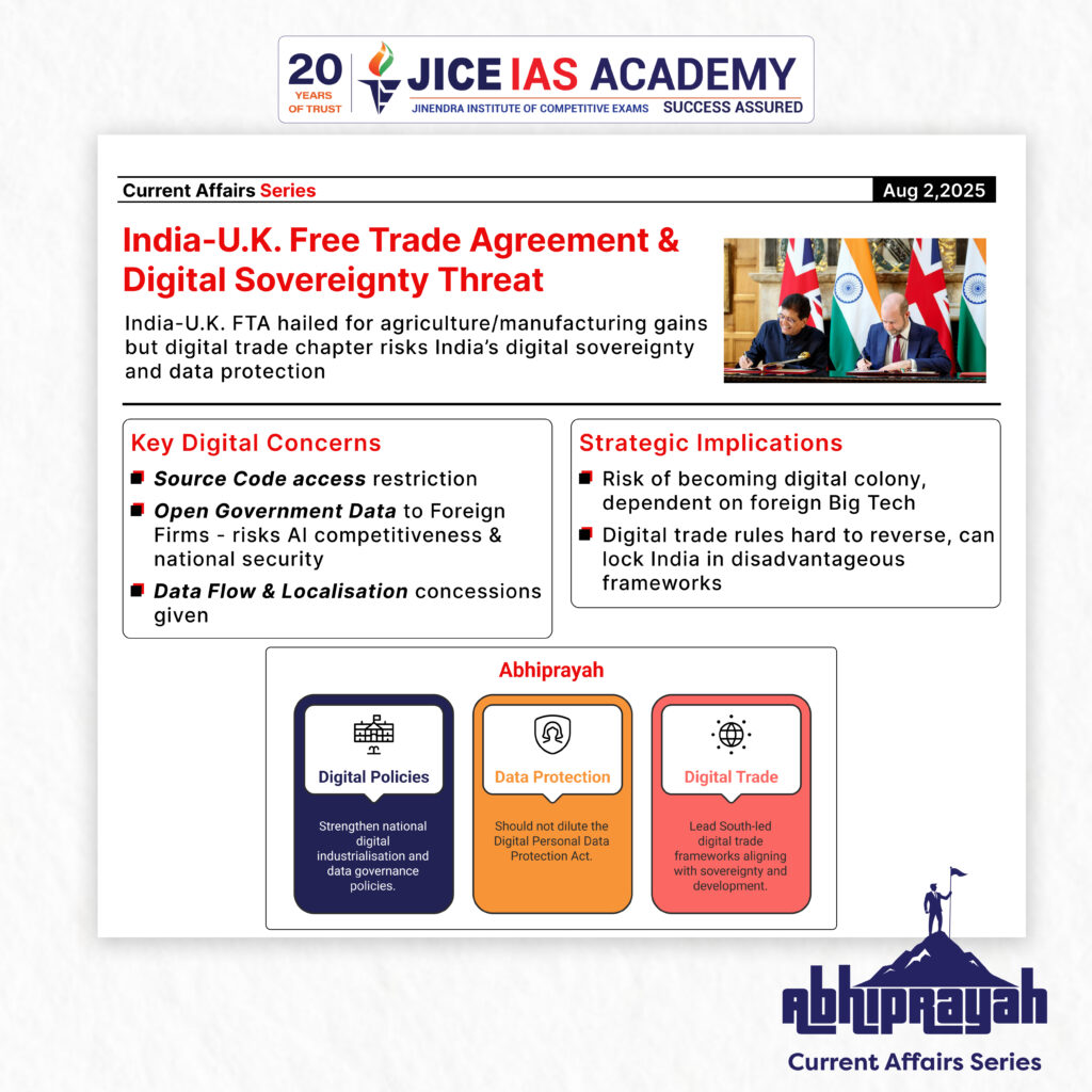 UPSC CURRENT AFFAIRS – 02nd August 2025 Home / India-U.K. Free Trade Agreement and the Threat to India’s Digital Sovereignty Why in News? The India-U.K. Free Trade Agreement (CETA), hailed as a ‘gold standard’, includes controversial digital trade provisions that may undermine India’s long-held positions on digital sovereignty and national data protection. Introduction The recently concluded Comprehensive Economic and Trade Agreement (CETA) between India and the United Kingdom has been widely celebrated for securing favorable terms in agriculture and manufacturing. However, its digital trade chapter has attracted criticism from experts who argue that it compromises India’s digital sovereignty — a critical concern in today’s data-driven economy. The agreement includes unprecedented concessions that contradict India’s earlier stances at global forums such as the WTO, especially regarding source code access, data governance, and open government data. Key Digital Sector Concerns in the FTA 1. Source Code Disclosure Concession India’s earlier stance: Sought ex ante (pre-emptive) access to source code for regulatory scrutiny in critical digital sectors like AI, telecom, and health tech. CETA’s provision: Restricts India’s ability to demand such access, allowing only ex post (after-the-fact) access during investigations. Implications: Undermines regulatory autonomy. Hampers real-time monitoring of foreign digital services. Contradicts India’s past WTO position and global trend reversals (e.g., U.S. dropped similar positions in 2023). 2. Open Government Data for Foreign Access CETA grants non-discriminatory access to U.K. firms for India’s Open Government Data. Concerns: Data today is a critical economic and strategic resource, not just for transparency but for AI development and innovation. Foreign access could dilute India’s competitive edge in AI and compromise national security. Even though non-binding, the inclusion sets a precedent for future obligations. 3. Data Flow and Localisation Commitments India has resisted the free flow of data and opposed restrictions on data localisation at the WTO. FTA clause: India commits to enter consultations with the U.K. if similar concessions are granted to any other country. Implication: Introduces vulnerability in India’s future data policy flexibility. Creates external pressure for policy harmonisation that may be detrimental to India’s digital industrialisation. Strategic Implications 1. Risk of Becoming a ‘Digital Colony’ By surrendering data rights and digital policy space, India risks: Losing out in the global AI race. Becoming dependent on foreign Big Tech architectures. Reliving patterns of colonial exploitation, this time in the digital economy. 2. Irreversibility of Digital Trade Rules Unlike tariff concessions in goods, digital trade rules are structural and difficult to reverse. Early commitments can lock India into disadvantageous frameworks, limiting future digital innovation and industrial policy. 3. Absence of Domestic Advocacy The digital sector lacks a political constituency unlike agriculture or textiles. Hence, digital sovereignty issues are underrepresented in negotiations and overlooked in public discourse. Way Forward: Safeguarding Digital Sovereignty 1. Formulate a Digital Industrialisation Policy Develop a comprehensive national policy on digital sovereignty and data governance. Clarify national objectives on data localisation, platform governance, and digital infrastructure. 2. Integrate Digital Experts in Trade Negotiations Appoint digital economy experts and technologists as part of trade negotiation teams. Ensure top-level political backing to protect long-term strategic interests. 3. Develop India’s Own Digital Trade Framework Lead efforts to craft a South-led digital trade model aligned with developmental and sovereignty goals. Collaborate with other developing nations resisting western digital dominance. 4. Public Awareness and Legislative Backing Create wider awareness about digital sovereignty through public discourse. Pass robust data protection and digital competition laws to reinforce domestic policy strength in negotiations. Conclusion While the India-U.K. FTA is a diplomatic and economic milestone, the digital trade concessions present a serious challenge to India’s long-term digital autonomy and technological self-reliance. In the age of data-driven geopolitics, sovereignty is not just about borders — it is about algorithms, access, and infrastructure. India must not repeat the mistakes of the colonial past in the digital future. A clear national roadmap for digital industrialisation, informed policy frameworks, and assertive negotiation strategies are essential to secure a prosperous and independent digital future. Introduction Economic Implications For Indian Exporters These reforms reduce transaction costs and compliance hurdles Encourage a more competitive and efficient export environment Promote value addition in key sectors like leather For Tamil Nadu The reforms particularly benefit the state’s leather industry, a major contributor to employment and exports Boost the marketability of GI-tagged E.I. leather, enhancing rural and traditional industries For Trade Policy These decisions indicate a shift from regulatory controls to policy facilitation Reinforce the goals of Make in India, Atmanirbhar Bharat, and India’s ambition to become a leading export power Recently, BVR Subrahmanyam, CEO of NITI Aayog, claimed that India has overtaken Japan to become the fourth-largest economy in the world, citing data from the International Monetary Fund (IMF). India’s rank as the world’s largest economy varies by measure—nominal GDP or purchasing power parity (PPP)—each with key implications for economic analysis. Significance and Applications