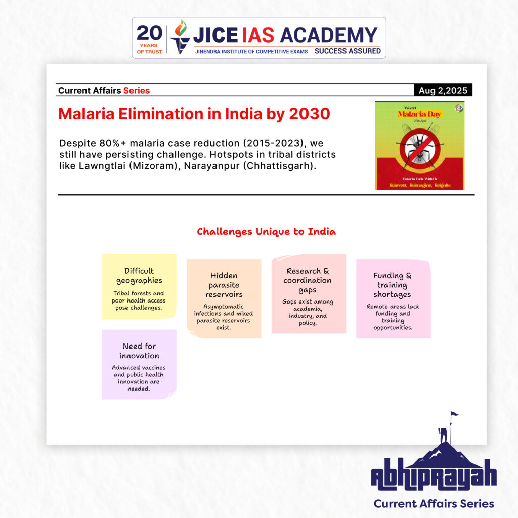 UPSC CURRENT AFFAIRS – 02nd August 2025 Home / Malaria Elimination in India by 2030: Innovations, Vaccines, and the New Battlegrounds Why in News? Despite major progress, India’s malaria elimination goal by 2030 faces new frontlines—hidden parasite reservoirs, dual-species infections, and the need for next-generation vaccines and public health innovation. Introduction India has made remarkable progress in malaria control, with an over 80% reduction in malaria cases between 2015 and 2023. Yet, the road to malaria elimination by 2030 is far from easy. Unlike before, the challenge is no longer a uniform national burden—it is about tackling resilient parasite strains, asymptomatic carriers, hard-to-reach tribal and forest regions, and technological gaps. The disease’s complex life cycle and the dual burden of Plasmodium falciparum and Plasmodium vivax require a multi-pronged, innovative approach rooted in science, vaccine development, policy cohesion, and health system preparedness. India’s Malaria Landscape: Uneven and Complex National gains mask localized hotspots, especially in tribal districts such as: Lawngtlai (Mizoram): 56 cases per 1,000 people Narayanpur (Chhattisgarh): 22 cases per 1,000 people Mixed infections, especially in Jharkhand, where 20% of cases show both P. falciparum and P. vivax, complicate treatment and tracking. P. vivax, unlike P. falciparum, can relapse from dormant liver forms, requiring longer-term strategies. Asymptomatic carriers quietly maintain transmission chains in areas showing “success” in reducing reported cases. Breakthrough Vaccines: Hope and Limitations First-generation vaccines like RTS,S and R21/Matrix-M offer partial protection (~55–77%) and target only one parasite stage, leading to reinfections. Whole-parasite vaccines (PfSPZ) and blood-stage vaccines (PfRH5) show higher efficacy and broader strain coverage but remain in trial phases. India’s AdFalciVax, developed by ICMR (2025), is a dual-stage vaccine targeting both infection and transmission. It is room-temperature stable, induced a strong immune response in mice, but human deployment may take 7–8 years. Transmission-blocking vaccines (TBVs), including India’s and global efforts (e.g., Mali, Thailand), show promise but face scalability and long-term efficacy challenges. AdFalciVax – India’s Indigenous Dual-Stage Malaria Vaccine (2025) Developed by Indian Council of Medical Research (ICMR). Dual-stage vaccine combining: PfCSP – Pre-erythrocytic antigen (prevents infection). Pfs230 & Pfs48/45 – Transmission-blocking antigens (prevent parasite spread via mosquitoes). Key Achievements: Induced a strong immune response in mice, lasting nearly a human decade. Stable at room temperature, making it suitable for rural deployment. Human trials yet to begin; deployment expected in 7–8 years. Marks India’s first major step into the domain of Transmission-Blocking Vaccines (TBVs). Transmission-Blocking Vaccines (TBVs) – Global and Indian Developments Pfs230D1 (Mali trial): Achieved 78% reduction in transmission. AdFalciVax (India): Integrates both infection prevention and transmission-blocking. For Plasmodium vivax: Pvs230D1M (Thailand trial): Reduced mosquito transmission by up to 96%. India is also developing TBVs specifically targeting vivax. New Vaccine Frontiers Immune Response Boosters Ferritin nanoparticle + CpG adjuvant: Cut liver-stage parasite load by 95% in mice AdFalciVax + Alum: Showed 90%+ protection with even mild adjuvants mRNA-based Platforms CureVac + NIH (Pfs25 antigen): Complete mosquito transmission blockage in mice BioNTech (BNT165e): mRNA-based blood-stage vaccine, FDA put on hold T-Cell Directed Vaccines Modified PfCSP + MIP3α molecule → enhanced T-cell targeting, 88% reduction in liver stage parasite load (in mice) Engineered Antibodies D1D2.v-IgG: Binds parasite protein (RIFIN) 110x more strongly, restoring immune function in lab tests Vector Control and Genetic Engineering Gene Drive Systems Fertility-disrupting genes introduced in Anopheles gambiae → colony wiped out in lab in 1 year Challenges: Ecological risks Evolution of resistance Ethical concerns Targeted Gene Editing (FREP1) One-letter gene change → malaria parasite development blocked in mosquitoes Spread to 90% lab population in 10 generations Self-Limiting Infections Mosquitoes die sooner if infected → reduces transmission naturally Less selective pressure on parasite → lower resistance risk Challenges Unique to India Difficult Geographies Northeast, central tribal belts, and forested areas → poor health access Asymptomatic Reservoirs Adults and older children carry parasites silently Require mass surveillance and diagnostics Mixed Infections Need dual-species vaccines, drugs, and diagnostic tools Research Gaps P. cynomolgi is the best model for P. vivax, but legal hurdles in primate research stalled Indian progress Coordination Deficit Lack of collaboration between academia, industry, and policy Funding gaps, especially post-discovery phase Training gaps among doctors, paramedics in remote zones The Way Forward: A Full-Spectrum Strategy Science + Systems Innovation alone is not enough. Need: Trained personnel Surveillance of drug resistance Strengthened rural health infrastructure Strategic deployment of multiple vaccines Political Will and Public Investment Like COVID-19, malaria elimination needs a mission-mode approach Push for GMP-grade production, clinical trial infrastructure, public-private partnerships Inclusive Health Policies Prioritize tribal and vulnerable regions Combine vector control, vaccines, and community engagement Global and National Collaboration Build alliances with WHO, ICMR, SII, NIH, and academic networks Conclusion While the India-U.K. FTA is a diplomatic and economic milestone, the digital trade concessions present a serious challenge to India’s long-term digital autonomy and technological self-reliance. In the age of data-driven geopoliti