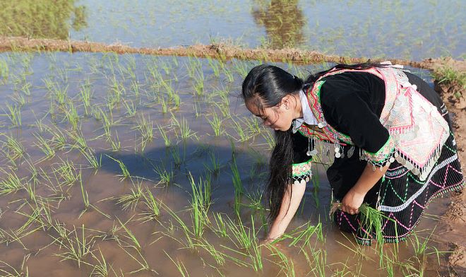 woman kneeling in a flooded rice paddy