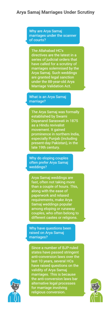 - The Allahabad High Court recently directed the Uttar Pradesh government to investigate the proliferation of fake Arya Samaj societies that are solemnising marriages without verifying the age of the bride and groom.