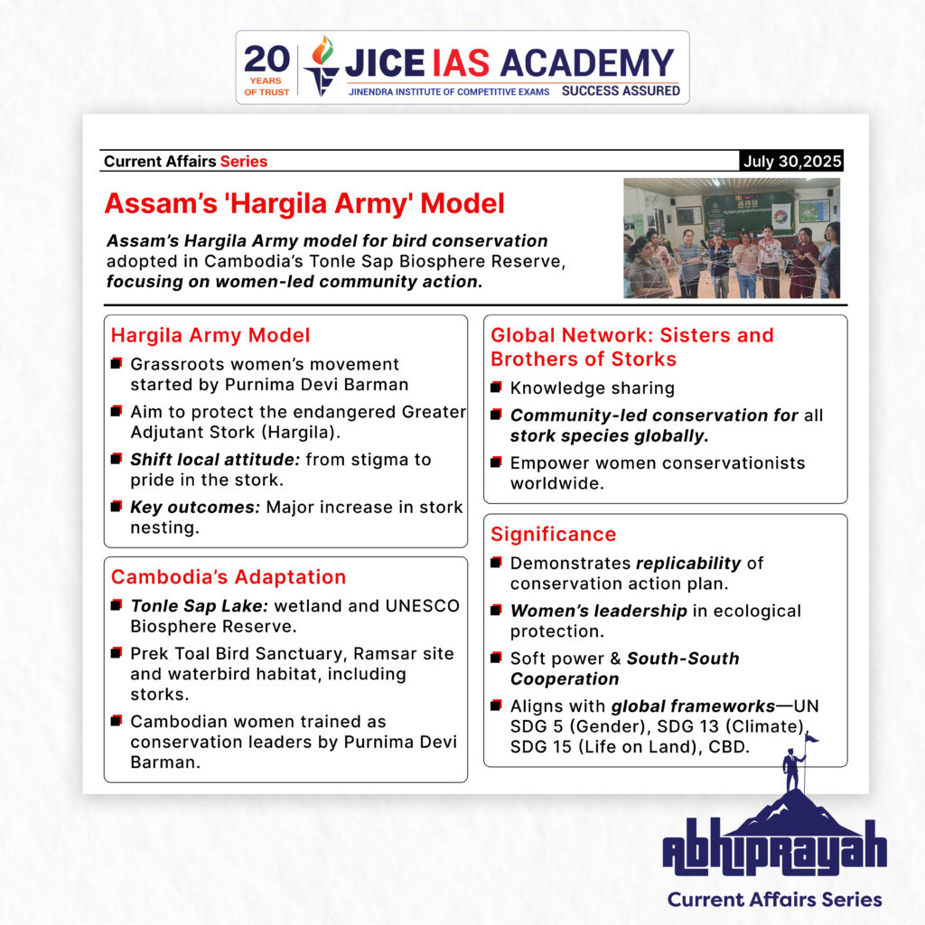 - A women-led grassroots conservation movement initiated in Assam to protect the endangered Greater Adjutant Stork (Leptoptilos dubius), locally known as Hargila.