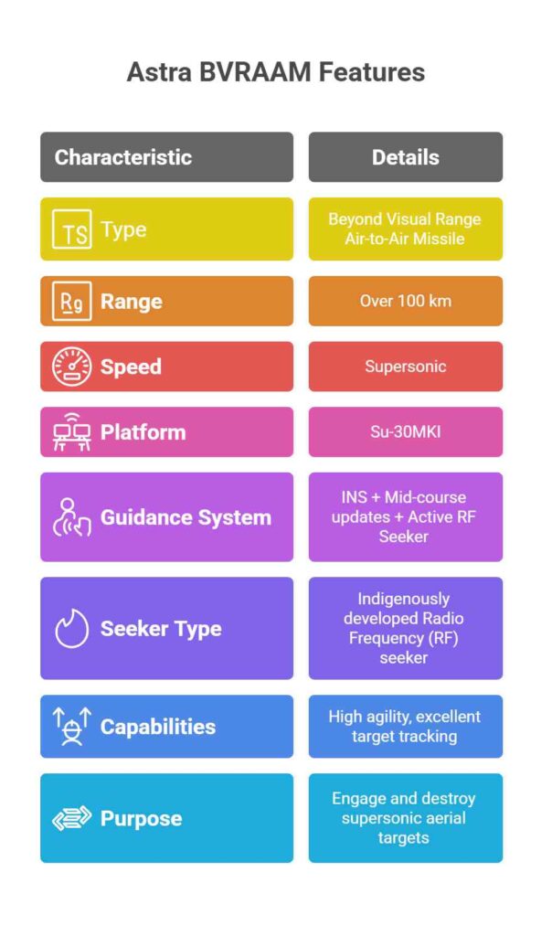 - Enhanced Air Superiority: With a range exceeding 100 km, Astra provides the IAF with a significant edge in Beyond Visual Range combat, enabling first-shot, first-kill capability.