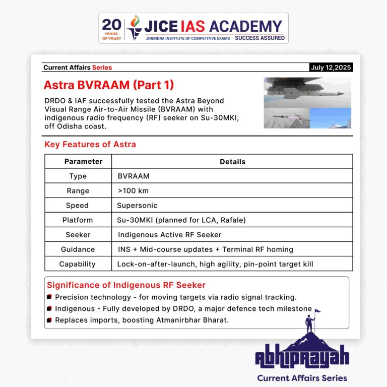 DRDO and IAF successfully flight-tested the indigenous Astra BVRAAM with an indigenous Radio Frequency seeker, marking a major milestone in India’s air-to-air missile capability.