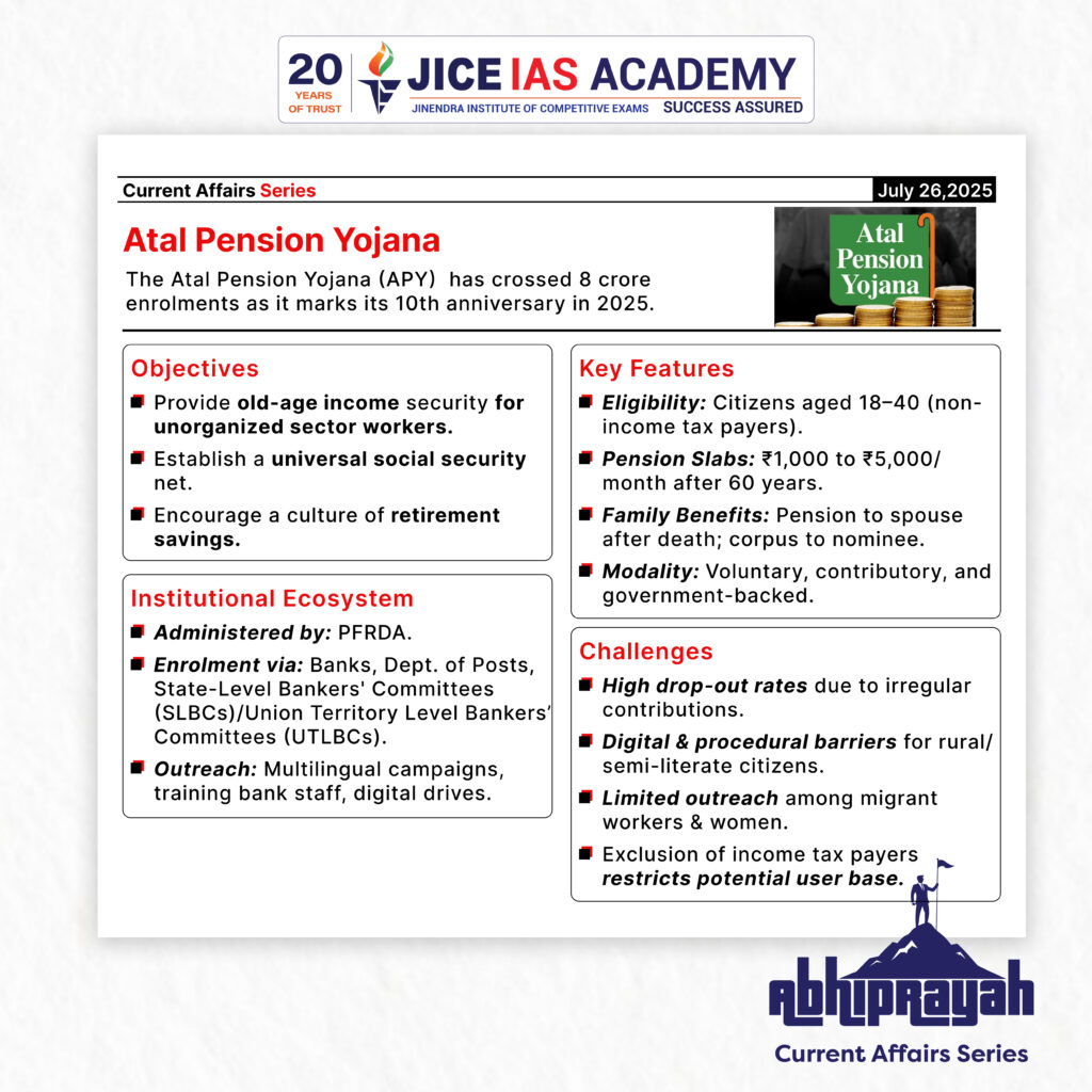 - The Atal Pension Yojana has emerged as a cornerstone of India’s social security architecture, especially for the vulnerable and underserved segments of society. Surpassing 8 crore enrolments within a decade underscores its wide acceptance and critical role in enhancing retirement security. Going forward, with appropriate policy interventions and stakeholder coordination, APY has the potential to ensure universal pension coverage and play a crucial role in achieving inclusive development goals.