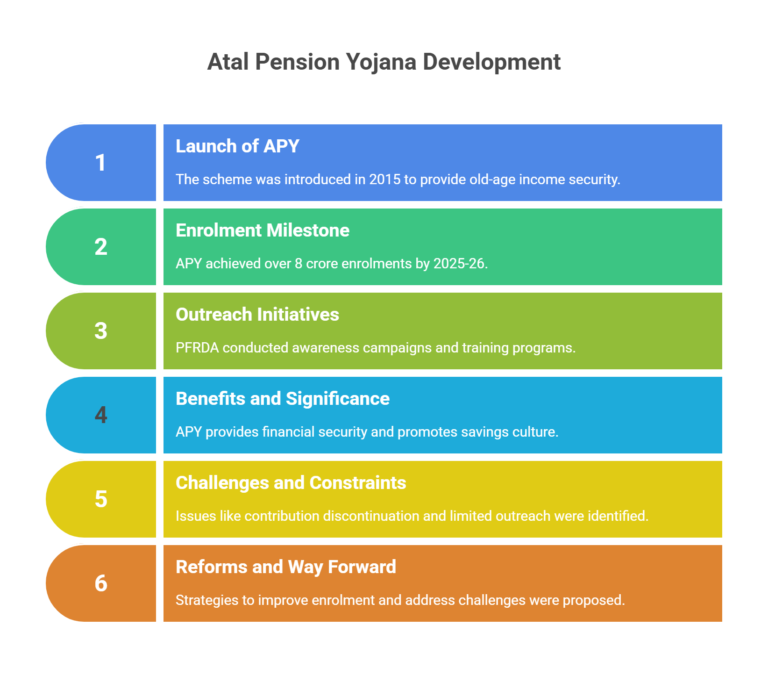 - The Atal Pension Yojana (APY), a flagship social security scheme of the Government of India, has crossed a major milestone by achieving over 8 crore gross enrolments as of the current Financial Year 2025–26, with 39 lakh new subscribers added this year alone.
