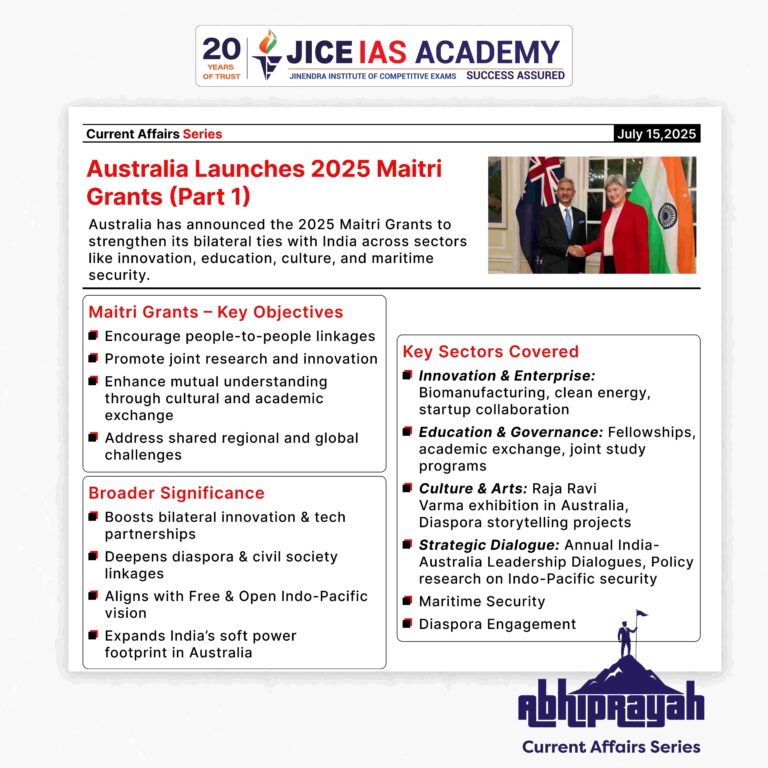 Australia has announced the 2025 Maitri Grants to strengthen its bilateral ties with India across sectors like innovation, education, culture, and maritime security.