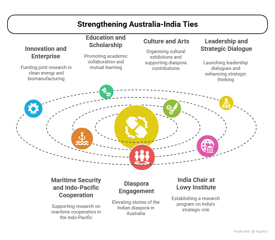 - These initiatives are a part of Australia’s broader engagement strategy with India, reflecting the deepening bilateral relationship across diverse sectors including innovation, education, culture, strategic affairs, and maritime security.