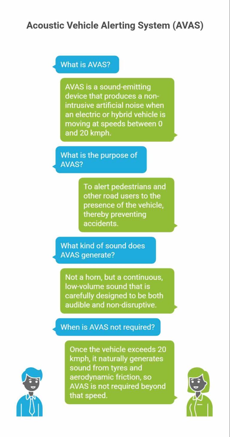 - Once the vehicle exceeds 20 kmph, it naturally generates sound from tyres and aerodynamic friction, so AVAS is not required beyond that speed.