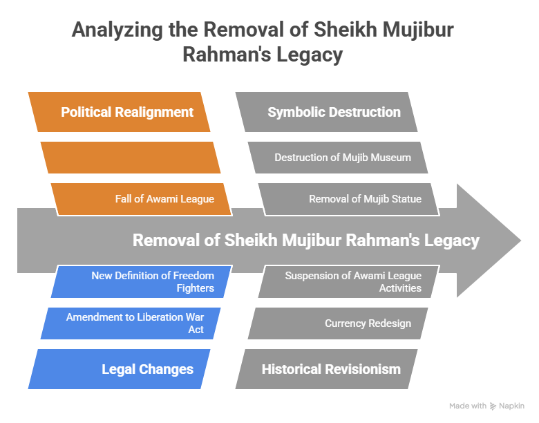 - The removal of Sheikh Mujibur Rahman’s name and image from foundational symbols and documents signals not just a transition of power, but a redefinition of national identity.