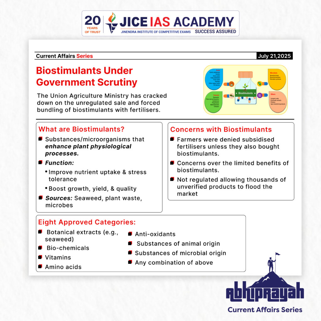 - This move follows widespread complaints from farmers and highlights the growing policy focus on regulating biostimulants in India’s agricultural input landscape.