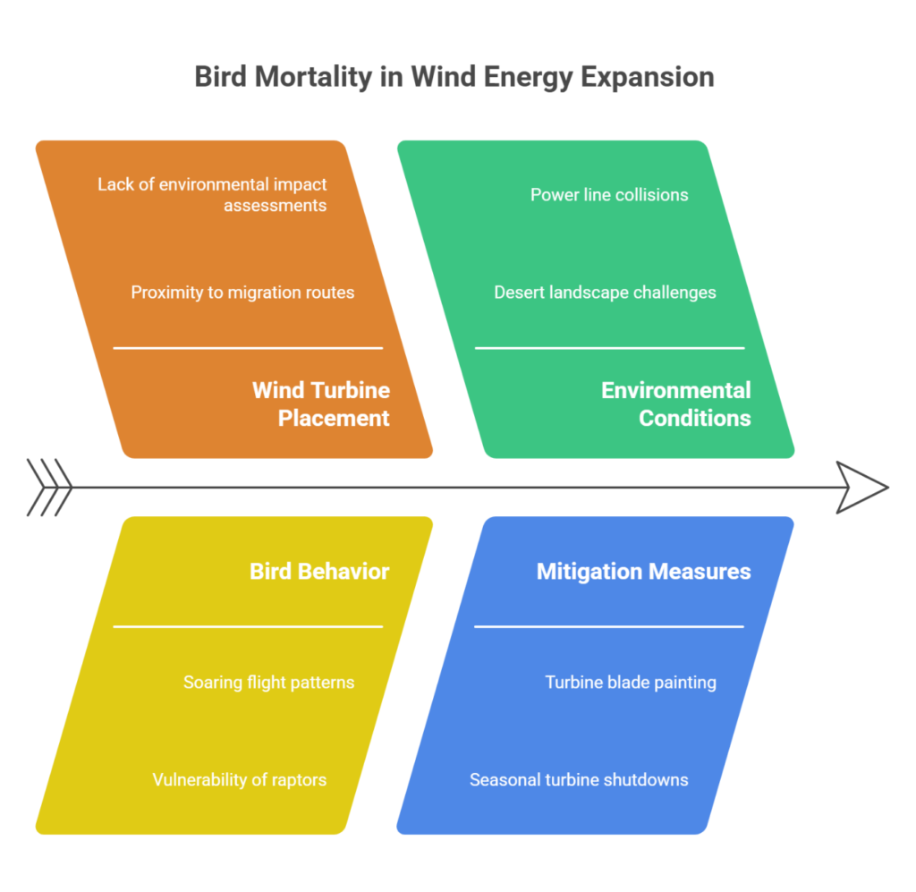 - Bird collisions occur due to the blade rotation and turbine height intersecting with migratory and soaring bird flight paths.