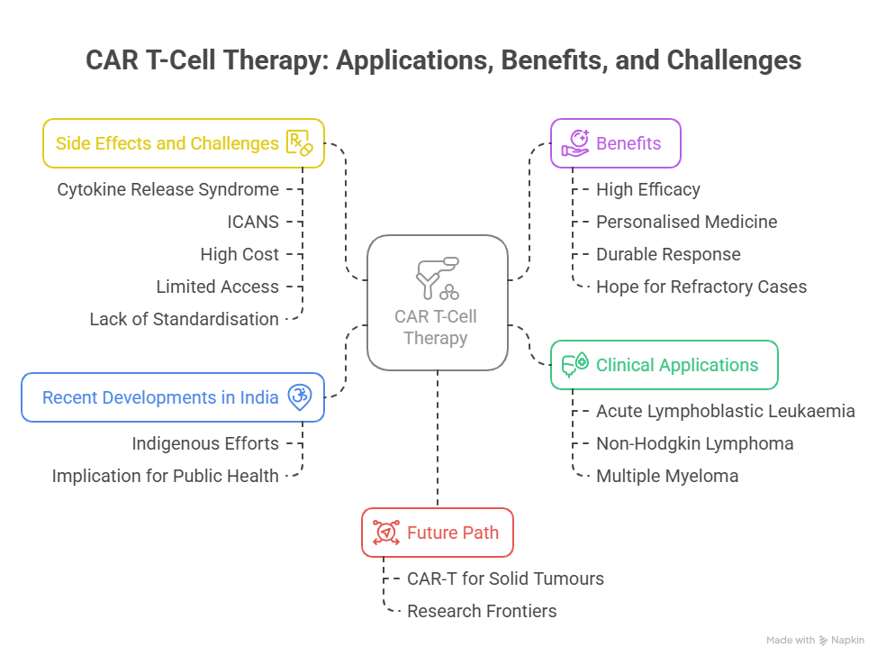 - The Indian Council of Medical Research (ICMR) funded trials led by Christian Medical College (CMC), Vellore, demonstrated that CAR-T therapy can be safely manufactured in hospitals using indigenous technology.