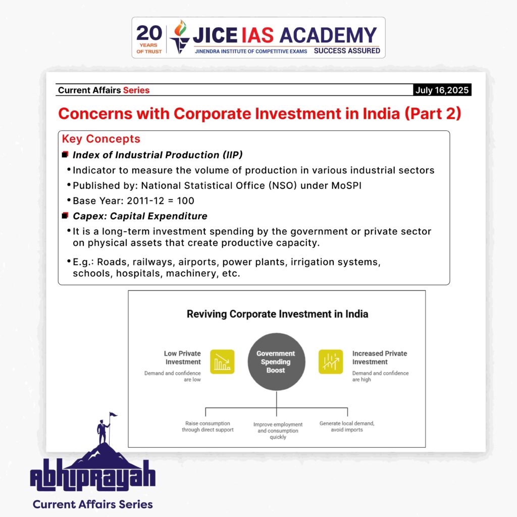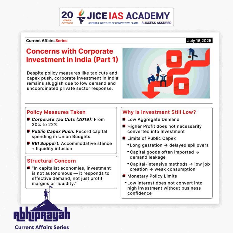 • Corporate investment in India remains subdued not due to lack of profitability or financing options, but due to structural constraints in demand revival. Policymakers must recognize that investment is not a self-sustaining engine in capitalist economies.