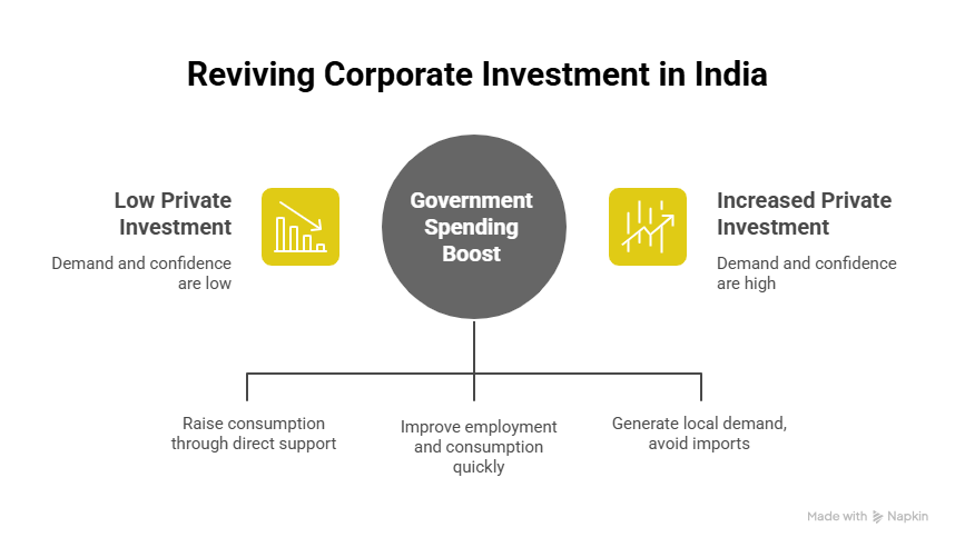 • Despite policy measures like tax cuts and capex push, corporate investment in India remains sluggish due to low demand and uncoordinated private sector response.