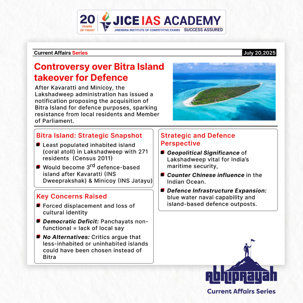 - The proposed takeover of Bitra Island underscores the strategic imperatives of India’s defence policy, but also raises serious ethical, legal, and democratic concerns. Balancing national security with local autonomy and cultural preservation will be crucial in navigating such contentious decisions. The issue may become a key point of debate in Parliament and possibly before the judiciary.