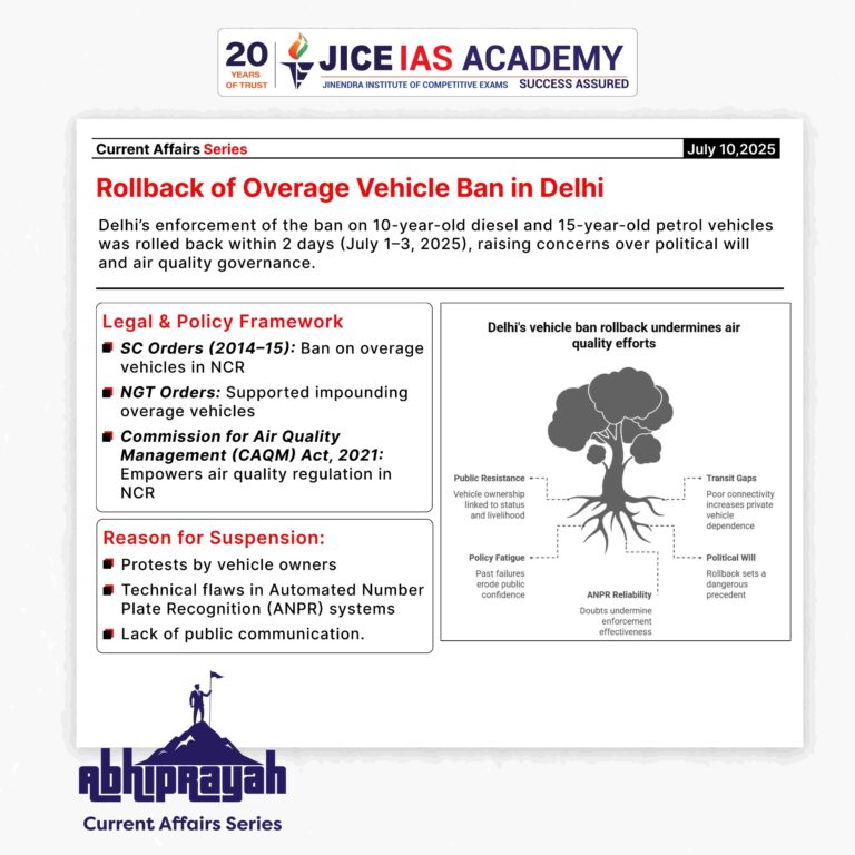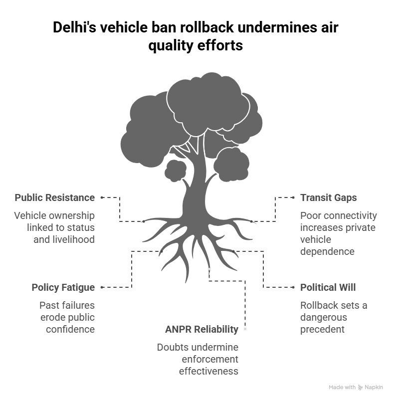Delhi’s attempt to enforce a decade-old ban on overage vehicles was rolled back within two days due to public protests, raising concerns over political will and environmental governance.