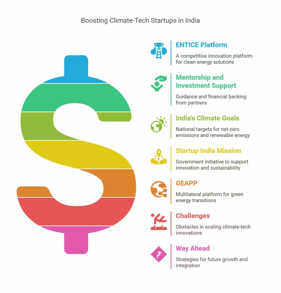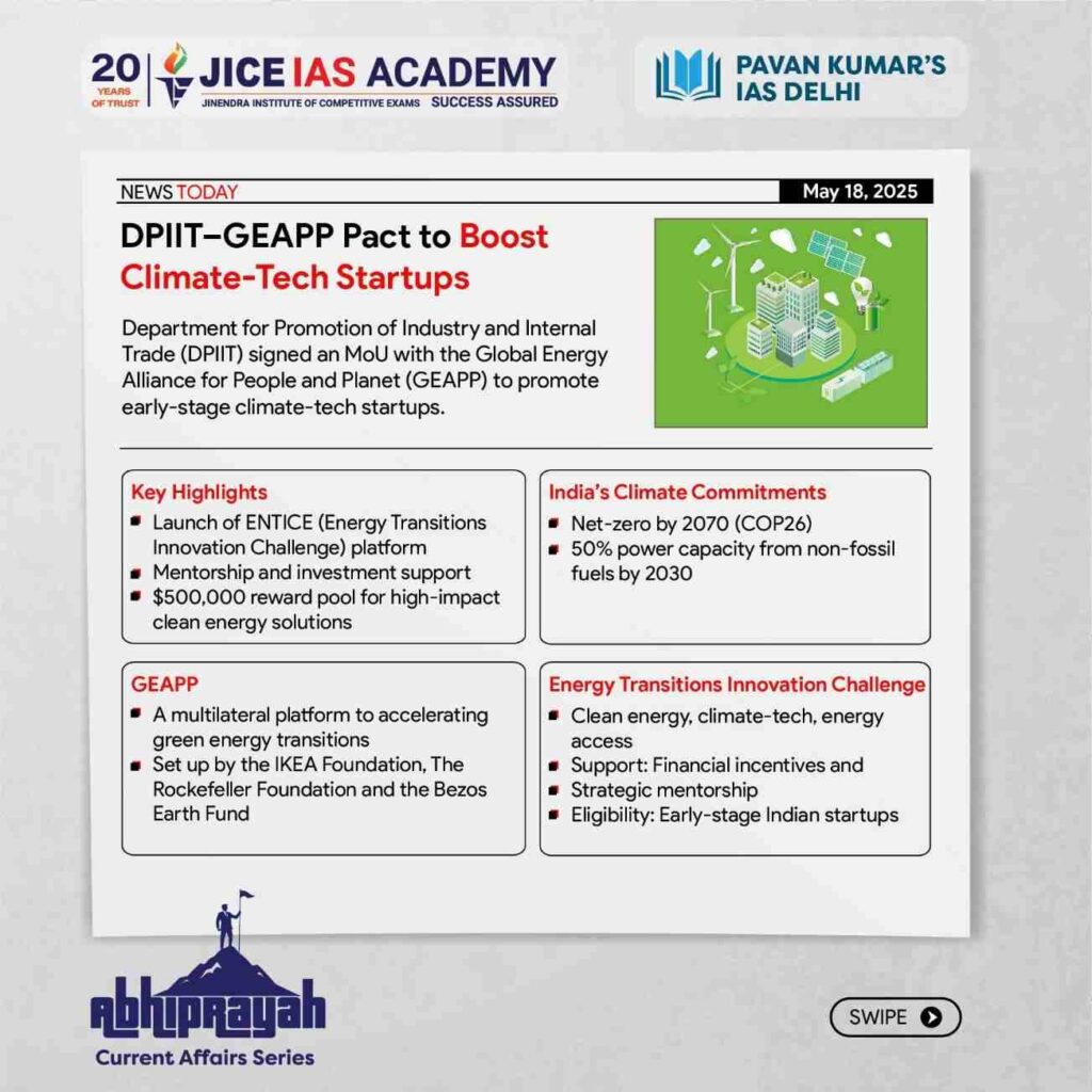 On May 17, 2025, the Department for Promotion of Industry and Internal Trade (DPIIT) signed an MoU with the Global Energy Alliance for People and Planet (GEAPP) to promote early-stage climate-tech startups through funding, mentorship, and innovation support. The partnership includes the launch of the ENTICE platform with rewards of up to $500,000 for high-impact solutions.