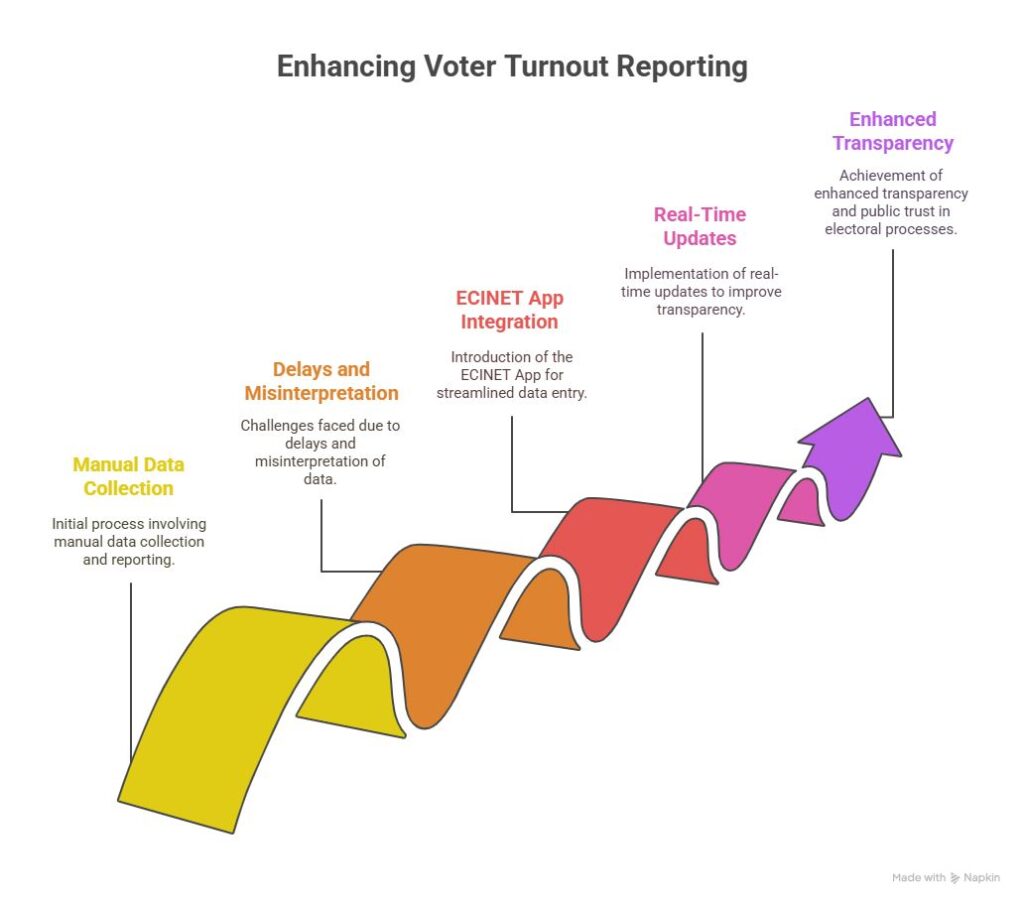 - While the statutory reporting remains unchanged, the Voter Turnout (VTR) App, previously used to provide non-statutory, indicative turnout data, faced delays due to manual processes.