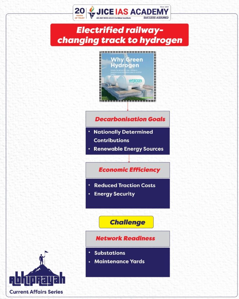 - For Indian Railways, the goal should be to strengthen electrified infrastructure, integrate more renewables into the grid, and explore hydrogen only where electrification is not feasible.