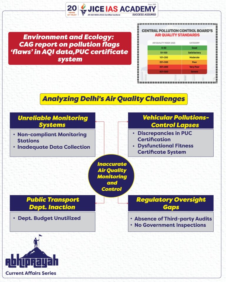 - The CAG report highlights serious inefficiencies in air quality monitoring and vehicular pollution control mechanisms in Delhi.