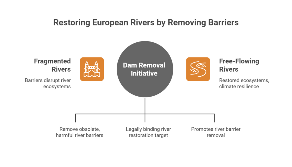 - The push aims to meet the EU’s Nature Restoration Law (2023) target of making 25,000 km of rivers barrier-free by 2030.