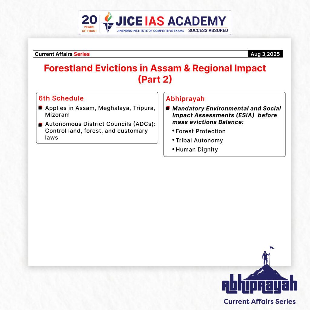 - The Meghalaya ADCs have opposed Assam’s actions in border zones, arguing that evictions disrupt tribal settlements protected by the 6th Schedule.