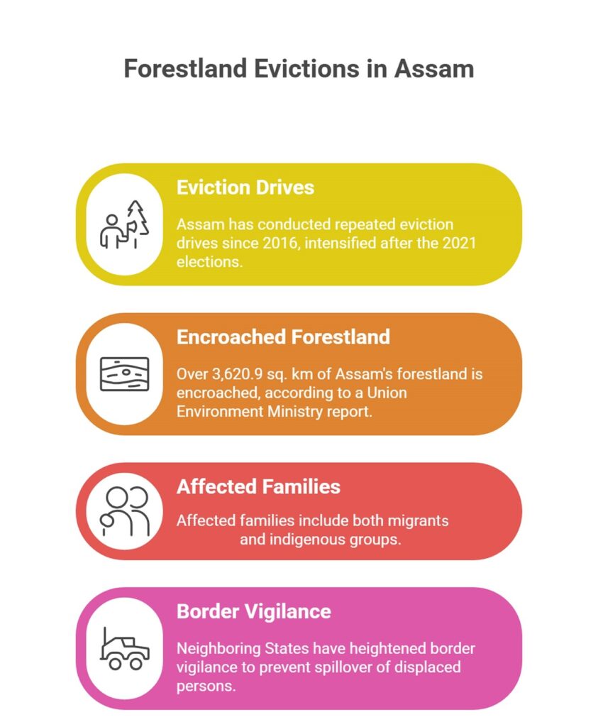 - Assam has conducted repeated eviction drives since 2016, intensified after the 2021 elections. In June–July 2025, over 1,000 families were evicted from Paikan Reserve Forest.