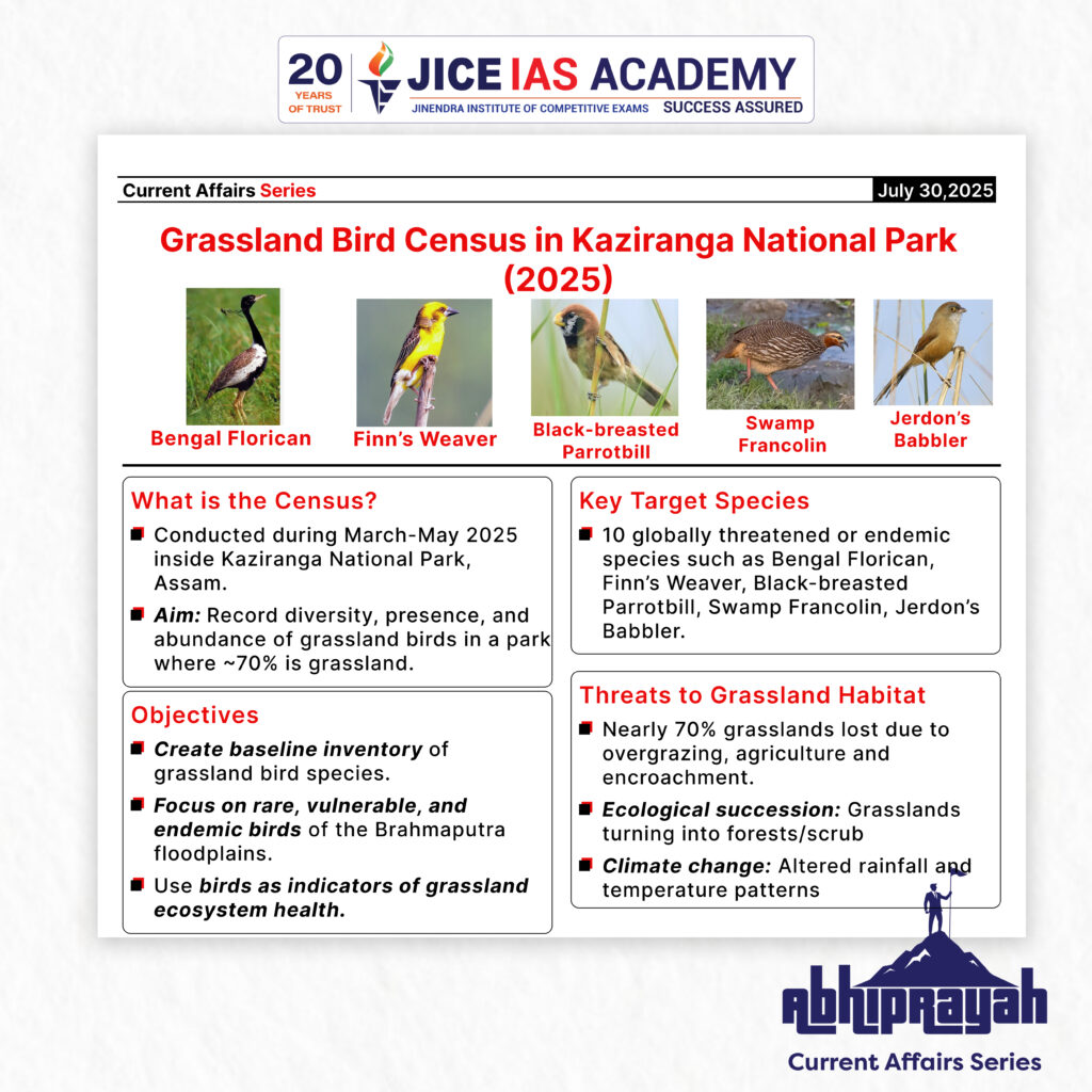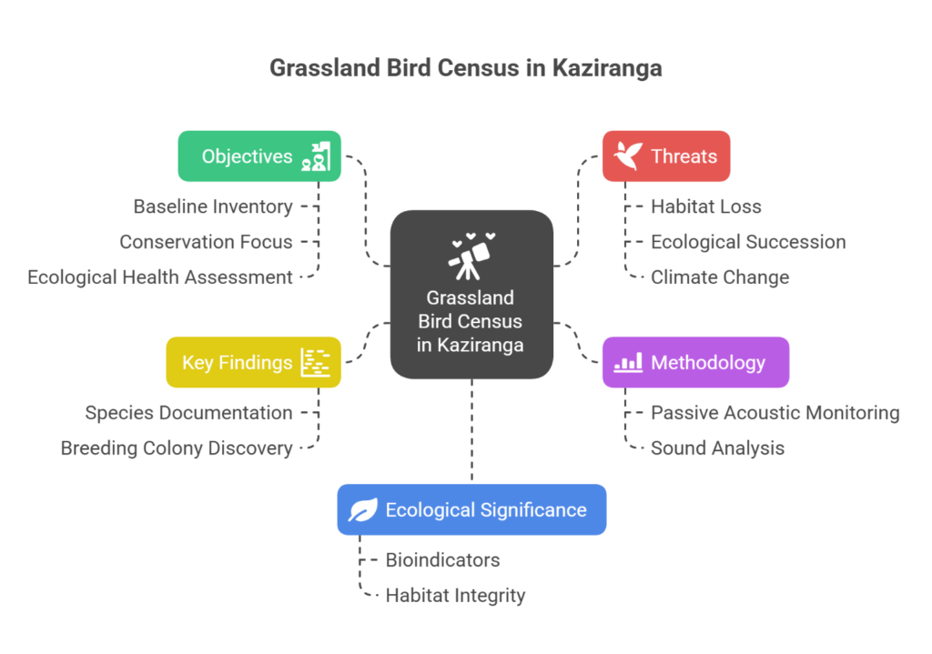 - The first-ever Grassland Bird Census in Kaziranga National Park (2025) used passive acoustic monitoring to document rare and endemic bird species.