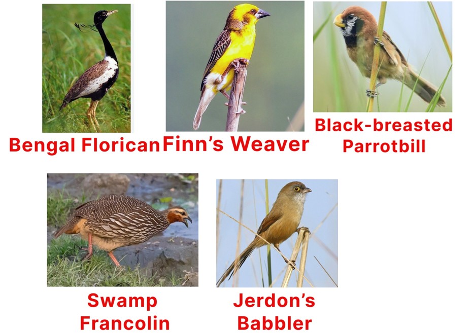 The census prioritized ten species considered globally threatened or endemic to the floodplain, including the Bengal Florican, Swamp Francolin, Finn’s Weaver, Swamp Grass Babbler, Jerdon’s Babbler, Slender-billed Babbler, Black-breasted Parrotbill, Marsh Babbler, Bristled Grassbird, and Indian Grassbird.