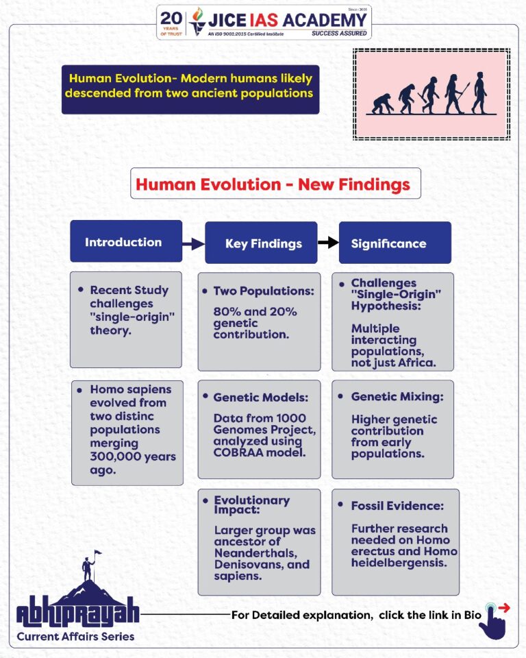 - Recent research published in Nature Genetics challenges the conventional belief that modern humans originated from a single ancestral population. Instead, the study suggests that Homo sapiens evolved from two distinct ancient populations, which intermingled approximately 300,000 years ago.