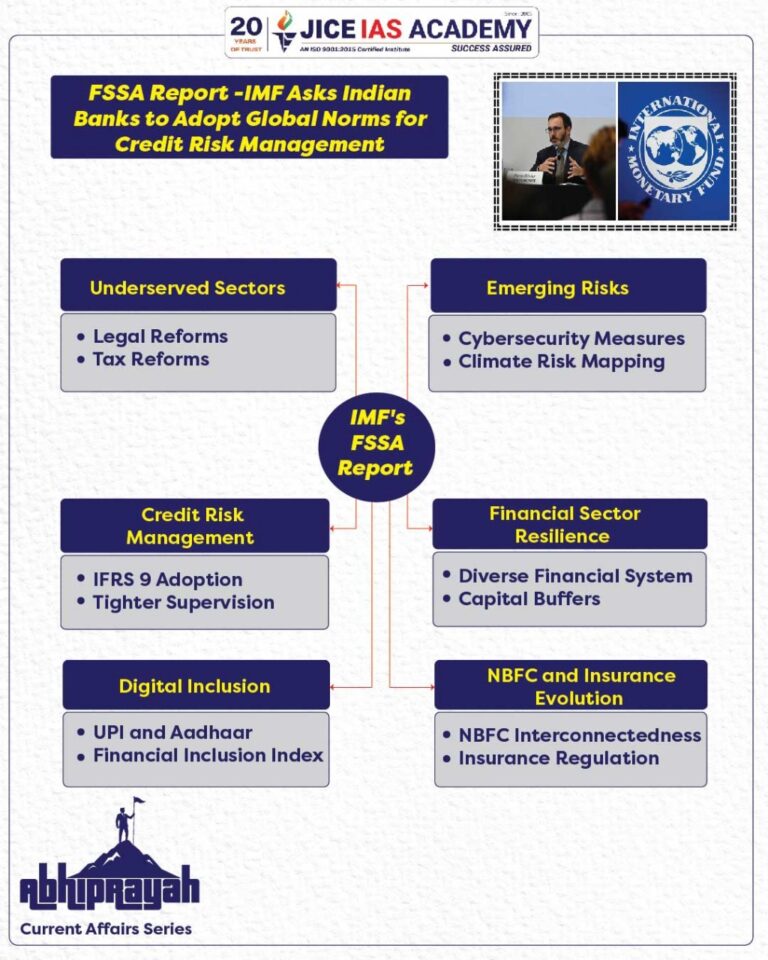In March 2025, the International Monetary Fund (IMF) released its Financial System Stability Assessment (FSSA) report for India as part of the Financial Sector Assessment Program (FSAP). The report, released by the Reserve Bank of India (RBI), highlights India’s financial sector progress since 2017 while recommending adoption of global risk norms like IFRS 9, and enhanced oversight in credit risk, insurance, and cybersecurity.