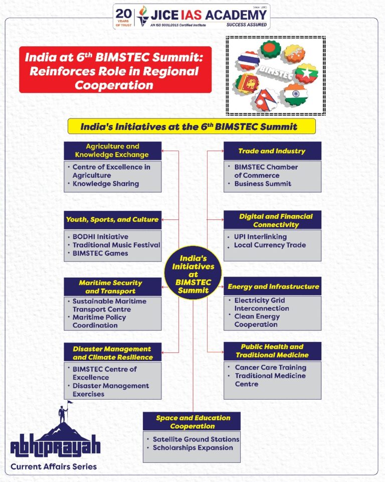 - At the 6th BIMSTEC Summit held in Bangkok in April 2025, India unveiled a broad set of initiatives to enhance cooperation across digital infrastructure, energy connectivity, trade in local currencies, maritime security, and human development.
