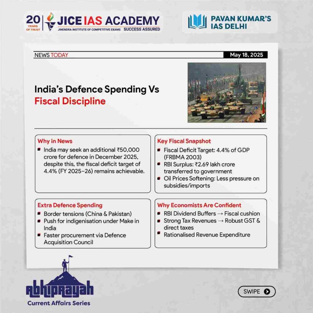 India is considering a ₹50,000 crore increase in defence expenditure through a Supplementary Demand for Grants in December 2025. Economists assert that despite this, India’s fiscal deficit target of 4.4% of GDP for FY2025–26 is likely to remain intact, due to higher revenues and prudent fiscal management.