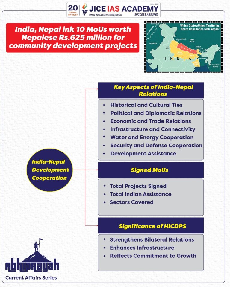 - These projects, funded by Indian assistance amounting to Nepalese Rs. 625 million, are part of the High Impact Community Development Projects (HICDPs) under the Nepal-India Development Cooperation initiative.