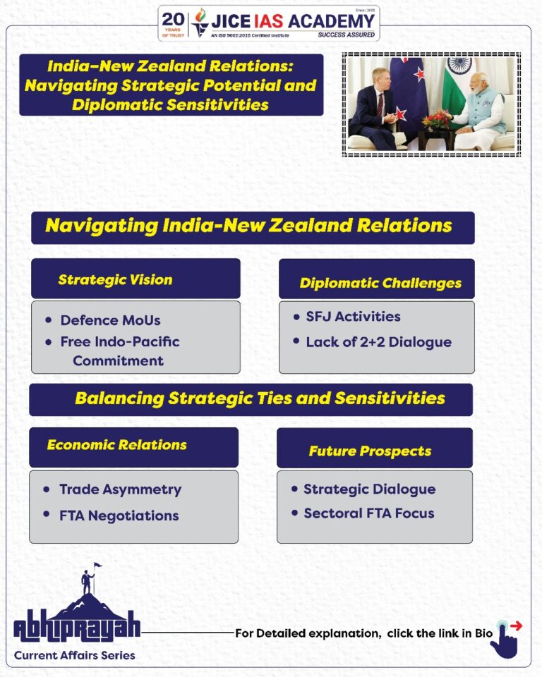 - India–New Zealand relations are often overshadowed by India’s ties with Australia, the US, and ASEAN.