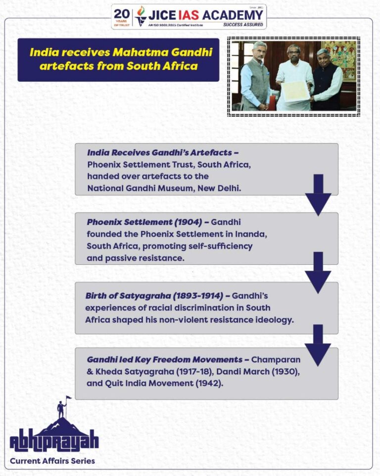 - The return of Mahatma Gandhi’s artefacts from the Phoenix Settlement Trust in South Africa underscores his enduring legacy and the deep historical ties between India and South Africa.