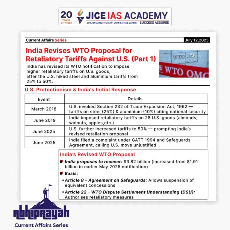 - This revision follows the U.S. decision to further increase tariffs on steel and aluminium imports from 25 percent to 50 percent. The proposal assumes importance as both countries are in the process of negotiating a Bilateral Trade Agreement (BTA), and India’s move aims to assert its rights under international trade rules while protecting domestic interests.
