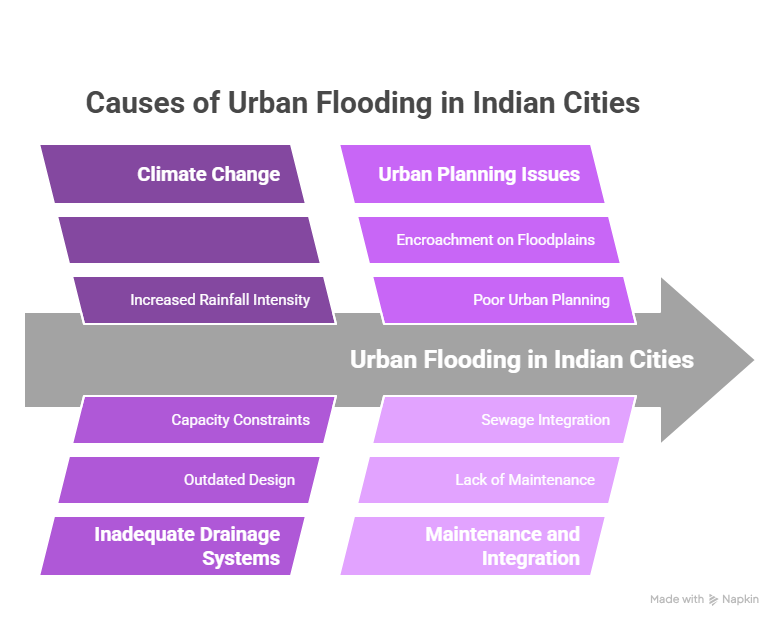 - Several Indian cities, including Delhi, Mumbai, and Bengaluru, have recently witnessed severe urban flooding due to intense rainfall and inadequate drainage infrastructure.