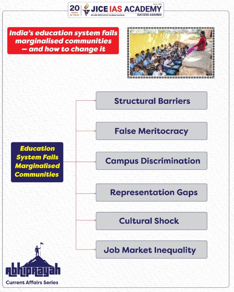 - Despite decades of affirmative policies, India’s education system continues to fail marginalised communities such as SCs, STs, OBCs, and economically weaker sections, by ignoring structural inequalities and perpetuating social exclusion.