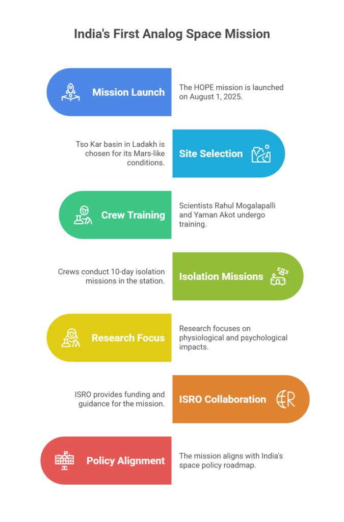 - India has launched its first analog space mission station, named Human Outer Planet Exploration (HOPE), on August 1, 2025, at Tso Kar, Ladakh.