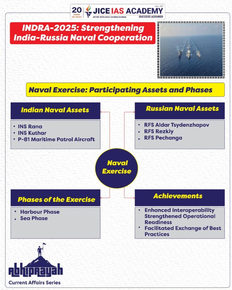 The 14th edition of the bilateral naval exercise INDRA-2025 was conducted between the Indian Navy and the Russian Navy from March 28 to April 2, 2025, off the coast of Chennai and in the Bay of Bengal. The exercise aimed to enhance interoperability and address common maritime security challenges.